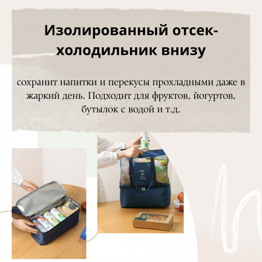 Нижний отдел — встроенная термосумка, которая сохраняет прохладу ваших напитков, фруктов и перекусов. Благодаря изолирующему слою и плотной молнии, всё останется свежим даже в самый жаркий день. Компактная, но вместительная, она легко вмещает всё необходимое для отдыха: пляжные аксессуары, еду, игрушки и даже небольшое одеяло. Удобные ручки позволяют носить её как в руке, так и на плече.