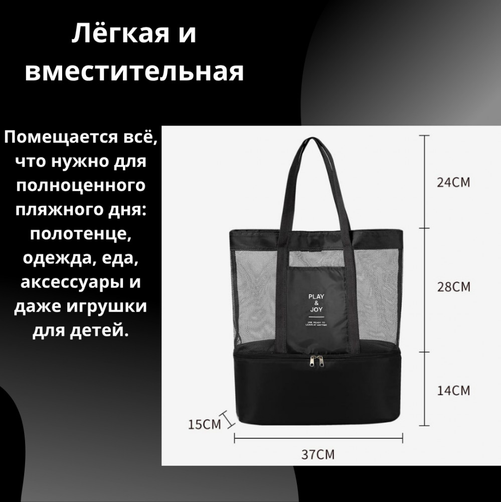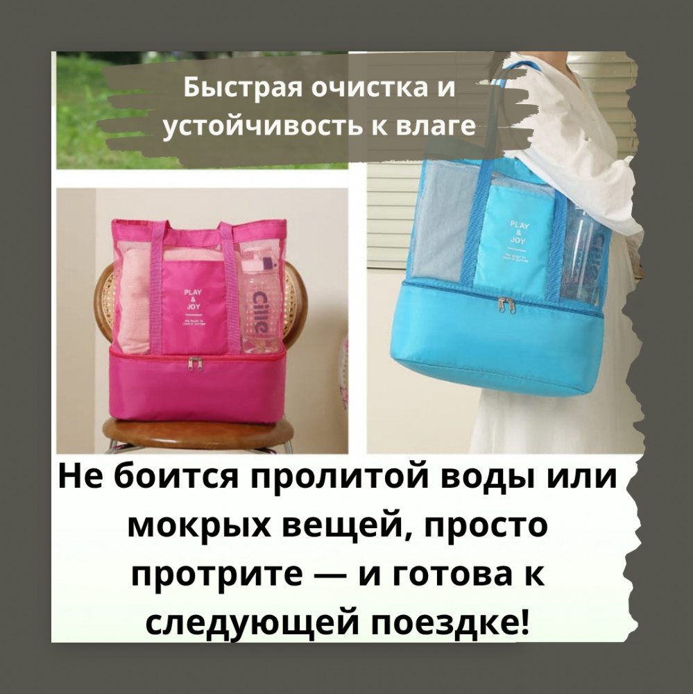 Нижний отдел — встроенная термосумка, которая сохраняет прохладу ваших напитков, фруктов и перекусов. Благодаря изолирующему слою и плотной молнии, всё останется свежим даже в самый жаркий день. Компактная, но вместительная, она легко вмещает всё необходимое для отдыха: пляжные аксессуары, еду, игрушки и даже небольшое одеяло. Удобные ручки позволяют носить её как в руке, так и на плече.