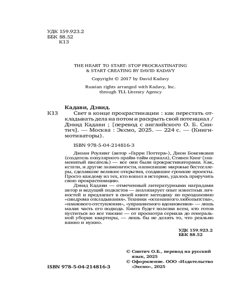 💳 Оплатить за товар можно при получении 🇰🇿 Есть бесплатная доставка по Казахстану от 1 дня 🎁 Копите бонусы с каждой покупки Серия: Книги-мотиваторы Джоан Роулинг (автор «Гарри Поттера»), Джон Бокенкамп (создатель популярного прайм-тайм сериала), Стивен Кинг (знаменитый писатель) — все они были прокрастинаторами. Как, кстати, и другие знаменитости, написавшие мировые бестселлеры, сделавшие великие открытия, создавшие громкие проекты. Просто каждому из тех, кто вошел в историю, удалось приручить свою прокрастинацию. |