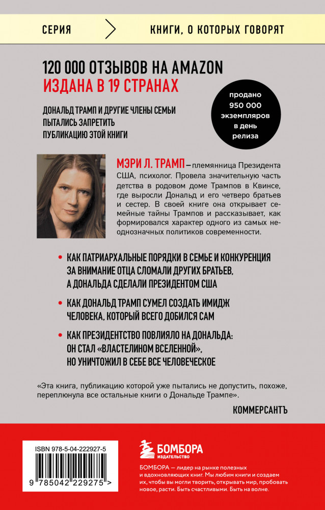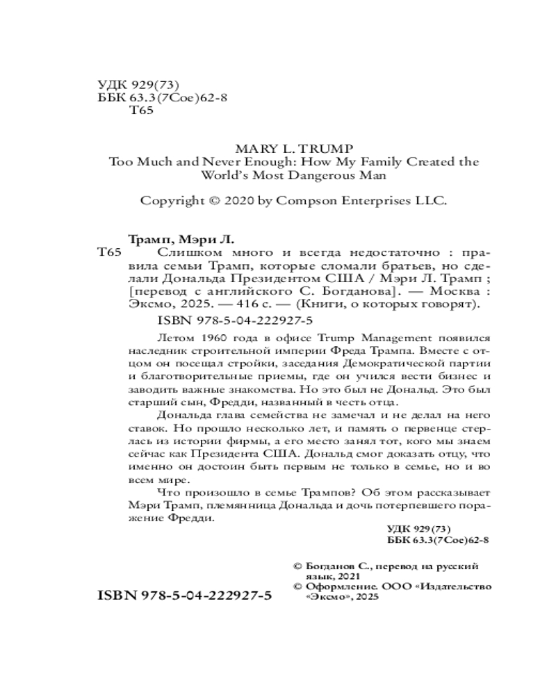💳 Оплатить за товар можно при получении 🇰🇿 Есть бесплатная доставка по Казахстану 🎁 Копите бонусы с каждой покупки Серия: Книги, о которых говорят Мэри Л. Трамп — клинический психолог, родная племянница Дональда Трампа. Она провела значительную часть детства в доме бабушки и дедушки в Квинсе, где выросли Дональд и его четверо братьев и сестер. |