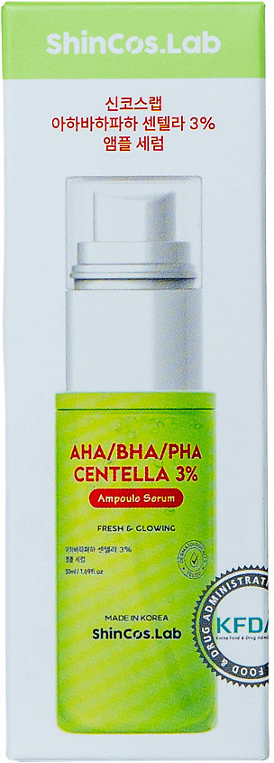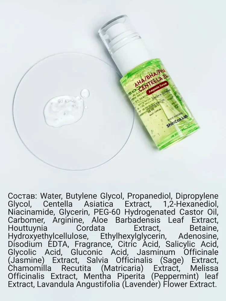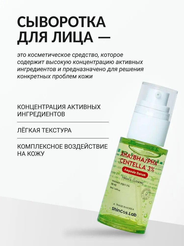 ShinCos.Lab Сыворотка для лица с 3% экстракта центеллы азиатской и комплексом кислот AHA, BHA, PHA успокаивающая «AHA/BHA/PHA Centella 3% Ampoule Serum»