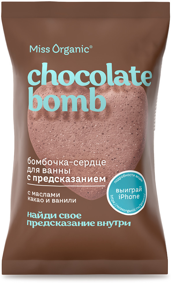 Miss Organic Бомбочка-сердце для ванны с предсказанием с маслами какао и ванили «Chocolate bomb»