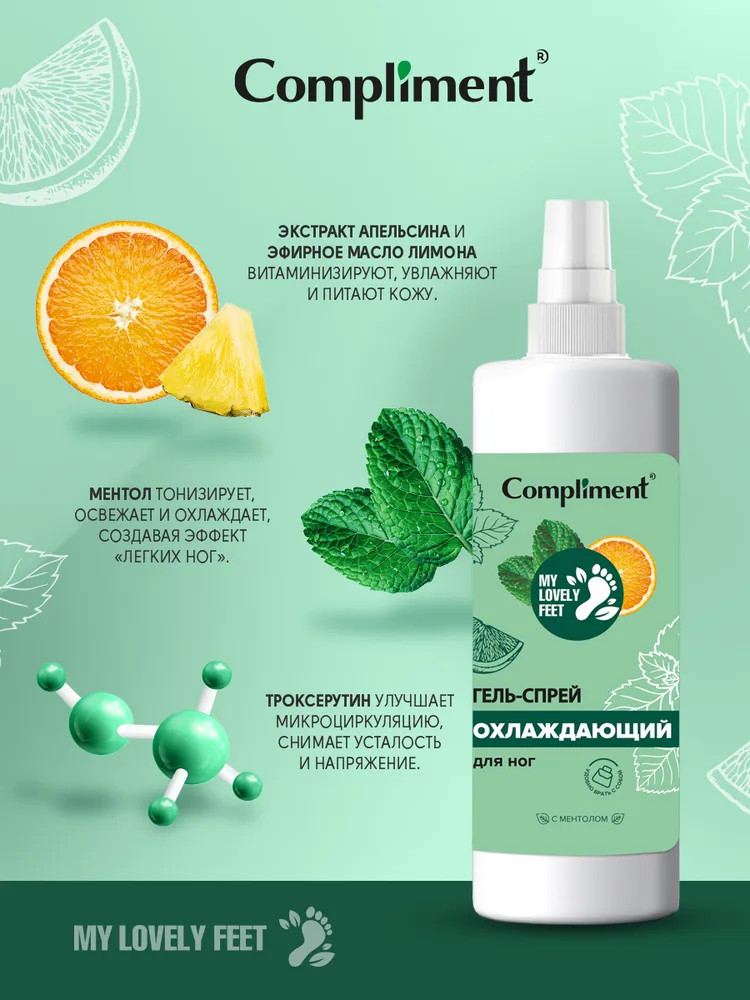 Compliment Гель-спрей для ног охлаждающийВ данный момент этот товар отсутствует в продаже. Возможно, у нас найдется аналогичный или похожий товар здесь. Серия: My Lovely Feet Благодаря сочетанию активных ингредиентов спрей-антиперспирант с освежающим приятным ароматом лимона и вербены рекомендован для поддержания свежести и комфорта кожи стоп в течение длительного времени, а удобный распылитель облегчает его использование. Высокоактивный комплекс, содержащий трегалозу, салициловую кислоту и эфирные масла чайного дерева и лимона, обеспечивает длительное подсушивающее, антибактериальное и антисептическое воздействия. Входящий в состав ментол освежает и тонизирует, устраняет нежелательные запахи. |
