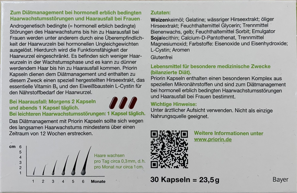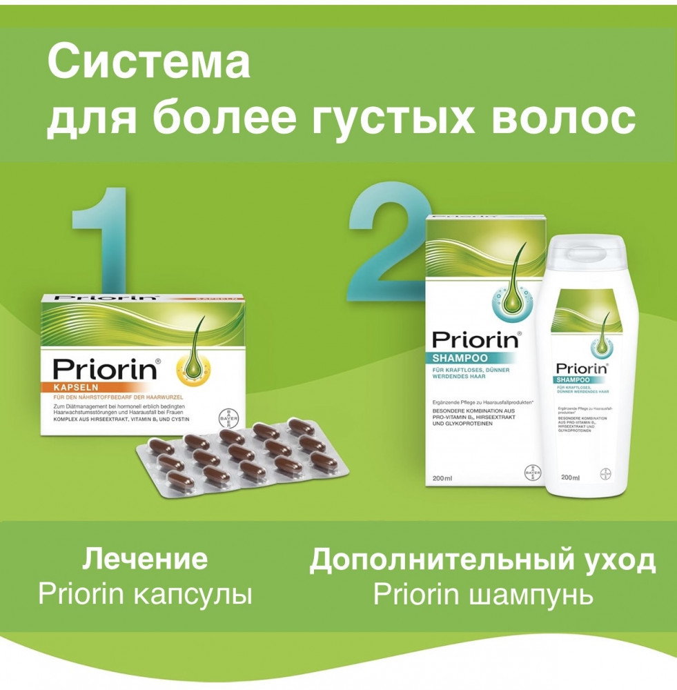 У жены сильно выпадали волосы после родов. Трихолог назначил принимать Priorin 3 капсулы в день в течение 3-х месяцев. После курса выпадение волос действительно прекратилось и даже в области залысин отрасли новые волосы. Жена очень довольна и теперь не нервничает из-за волос. Заказали еще упаковку, чтобы теперь принимать 1 капсулу в день.