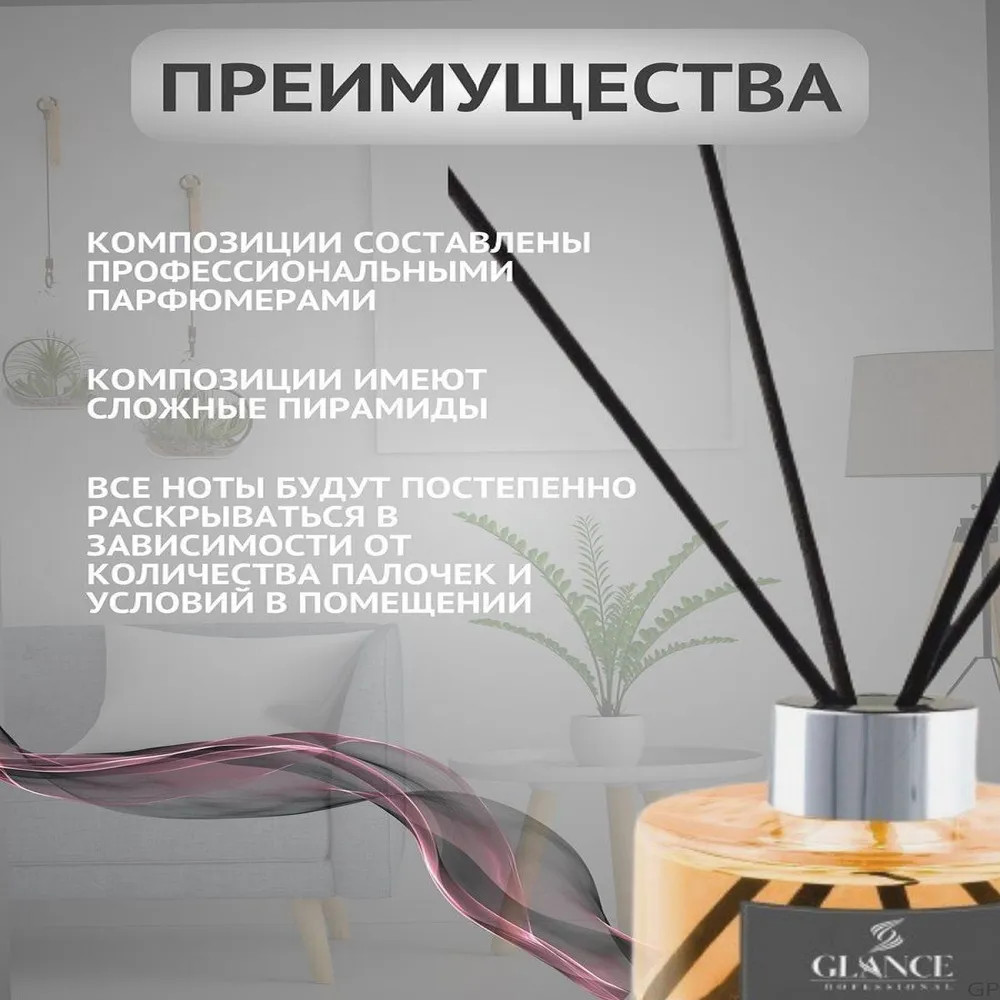 Парфюм для дома и офиса создаст приятную атмосферу и освежит любое помещение. Ароматизатор для дома Glance Professional — это уникальный интерьерный парфюм, состоящий из натуральных масел. Диффузор гармонично дополнит Ваш интерьер, создаст приятную ароматическую атмосферу. Диффузор Glance Professional раскрывает свою парфюмерную композицию постепенно, интенсивность зависит от количества ароматизированных палочек, размещенных в баночке. Брендовый диффузор компактной формы подойдет для любого интерьера: квартиры-студии или дома. Ароматизатор идеален для гостиницы или отеля, отлично подойдет для салона красоты. Диффузор используется не только для наполнения помещения приятным ароматом, но и для украшения.