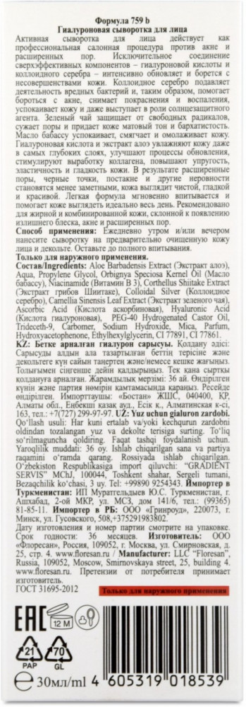 Floresan Сыворотка для лица гиалуроновая с коллоидным серебом