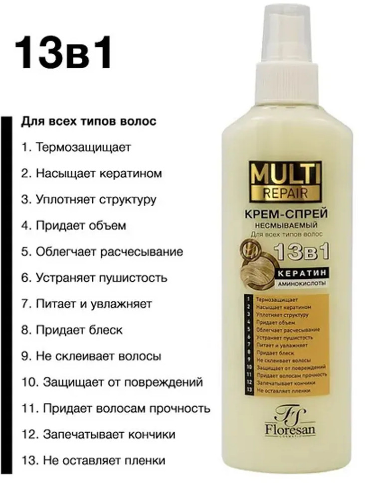 Floresan Крем-спрей для волос несмываемый «13 в 1»В данный момент этот товар отсутствует в продаже. Возможно, у нас найдется аналогичный или похожий товар здесь. Серия: Multi Repair Несмываемый крем-спрей с термозащитой — многофункциональное средство для блеска, объема, укладки и комплексного ухода за волосами. Один спрей заменит 13 косметических средств, подарит волосам красоту и здоровье. Многокомпонентная формула средства насыщает локоны кератином, защищает от уф-лучей и мороза, восстанавливает после окрашивания, обеспечивает термозащиту по всей длине, облегчает расчесывание, препятствует склеиванию волос. Уже после первого нанесения локоны становятся мягкими и шелковистыми, приобретают объем у корней и блеск. Подходит для волос любого типа, структуры и длины. |