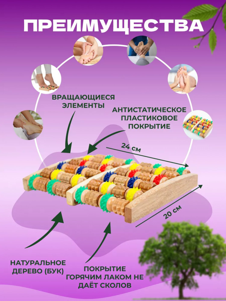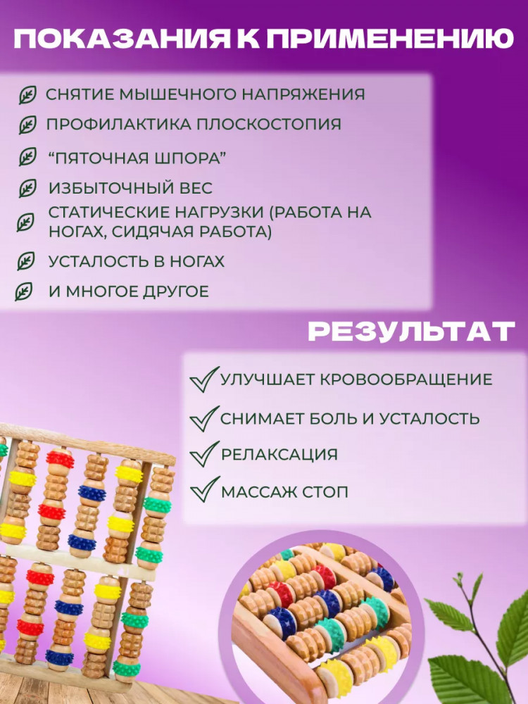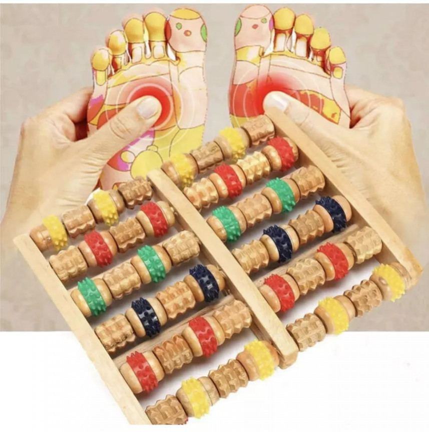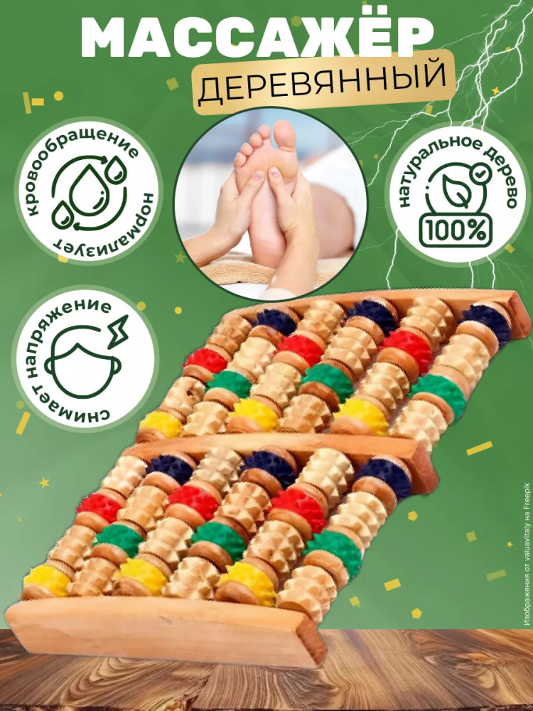 Деревянный массажер для ног и стоп — счёты зубчатые. Деревянный массажер для ног используется для массажа стоп, улучшения кровообращения, снятия мышечного напряжения и усталости. Массажер деревянный для стоп воздействует на разные участки стоп, массирует определенные зоны, что ведет к положительному воздействию на весь организм. Массажер зубчатый улучшает кровообращение, снимает усталость Зубчатые валики массажера покрыты специальным лаком, препятствующим сколам и защищающим дерево от влаги и перепада температур. Деревянные валики массажера располагаются на прочных деревянных осях. Массажер деревянный для ног можно использовать с кремами и мазями. Особенности: валики изготовлены из дерева; деревянные оси; возможно использование с кремами и мазями для ног.
