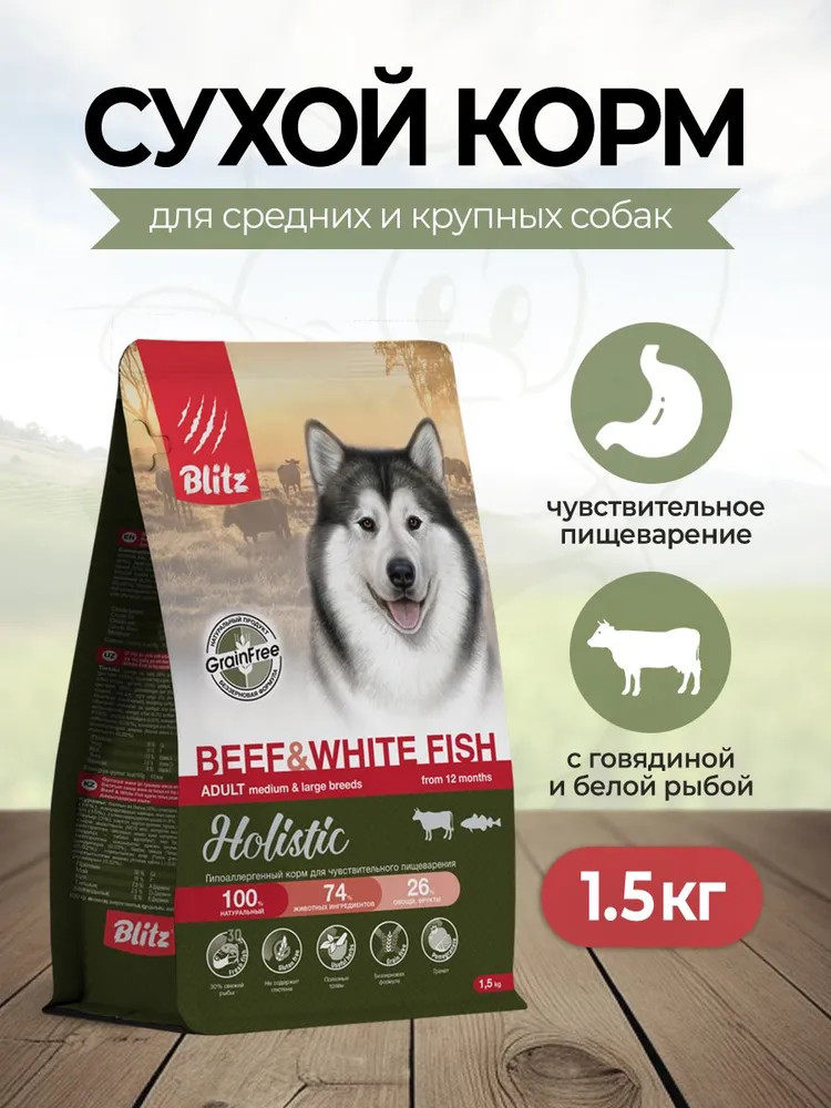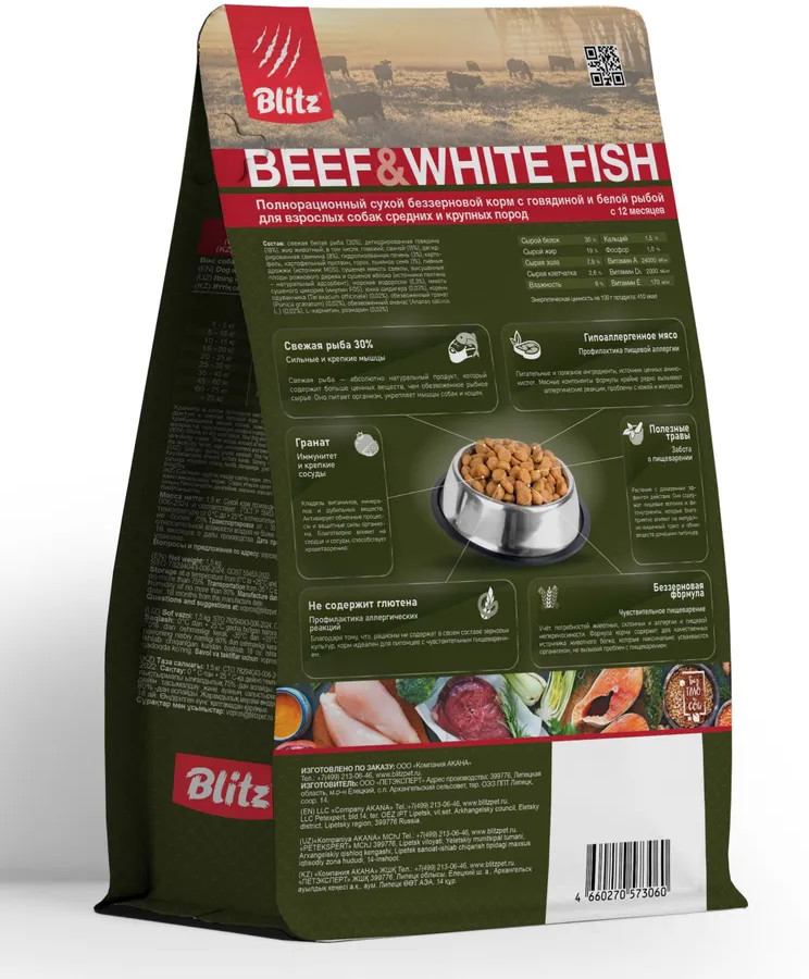 Blitz Корм сухой беззерновой для взрослых собак с говядиной и белой рыбой