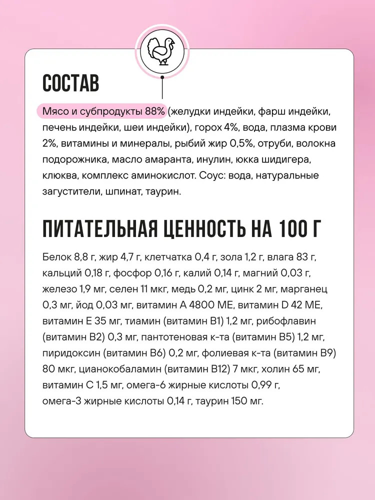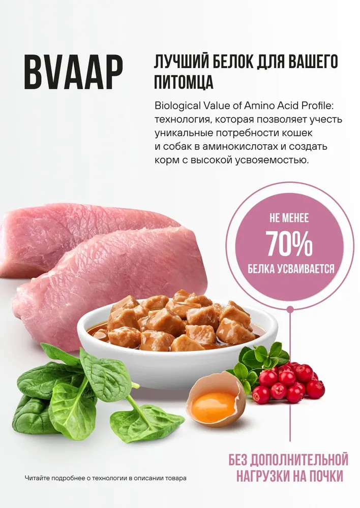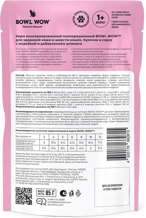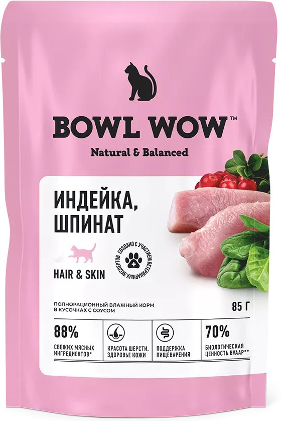 BOWL WOW Корм влажный для взрослых кошек для здоровой кожи и шерсти с индейкой и шпинатом