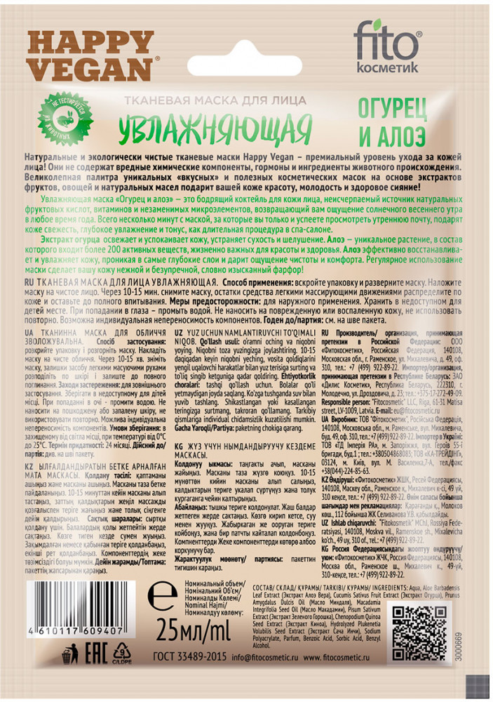 Фитокосметик Маска для лица тканевая увлажняющая «Огурец и алоэ»