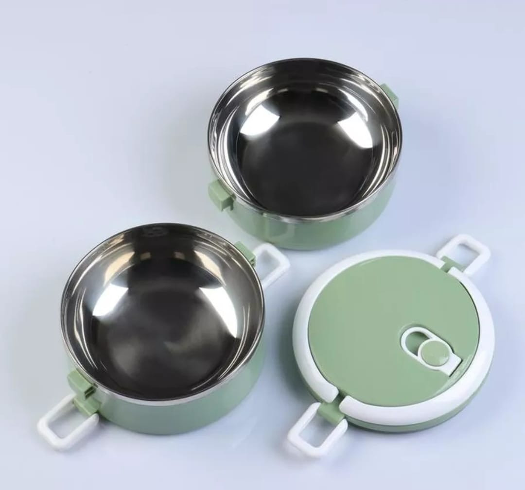 Внутренние секции выполнены из нержавеющей стали — прочного и безопасного материала, который легко очищается и не впитывает запахи. Наружная часть корпуса изготовлена из качественного пластика с приятным матовым покрытием нежно-зелёного цвета. Крышка оснащена герметичной системой закрытия с надёжными защёлками по бокам и клапаном для выхода пара. Это позволяет сохранять еду свежей и предотвращает протекание.