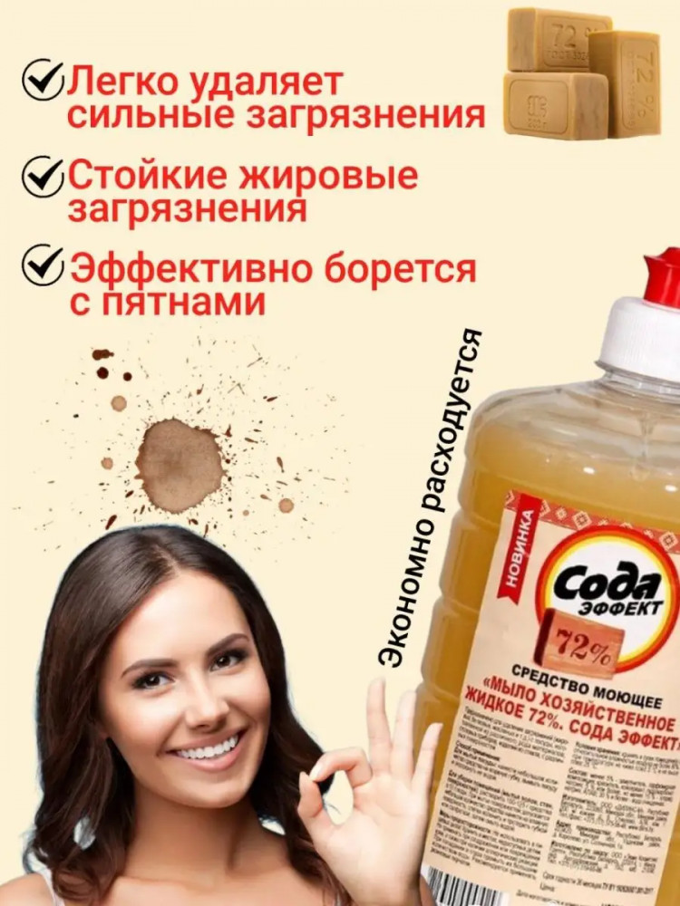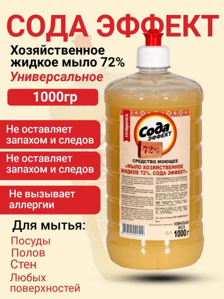 Универсальное моющее средство мыло жидкое хозяйственное 72% — сода эффект. Идеально подходит для удаления загрязнений (жировых, белковых, масляных и т.д) с посуды, изготовленной из различного рода материалов, столовых приборов, изделий из стекла, с различных поверхностей. А также используется для мытья посуды, рук, кухонной утвари, оконных рам, полов, ручной стирки и замачивания белья, стирки спортивной обуви. Является незаменимым средством для комплексной уборки. Легко удаляет сильные загрязнения, стойкие жировые отложения, эффективно борется с пятнами.