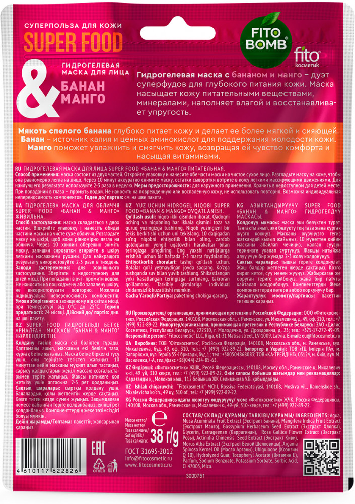 Fito Bomb Маска гидрогелевая для лица питательная «Банан и манго»