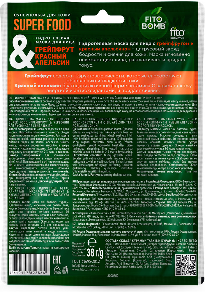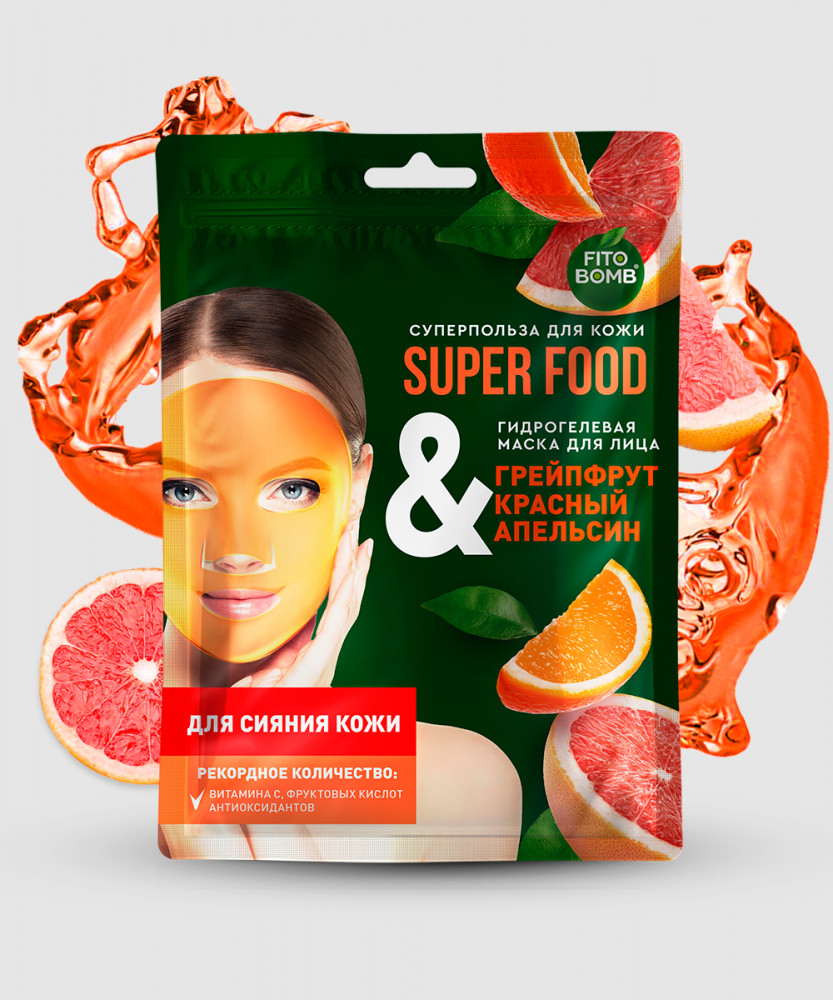 Fito Bomb Маска гидрогелевая для сияния кожи лица «Грейпфрут и красный апельсин»
