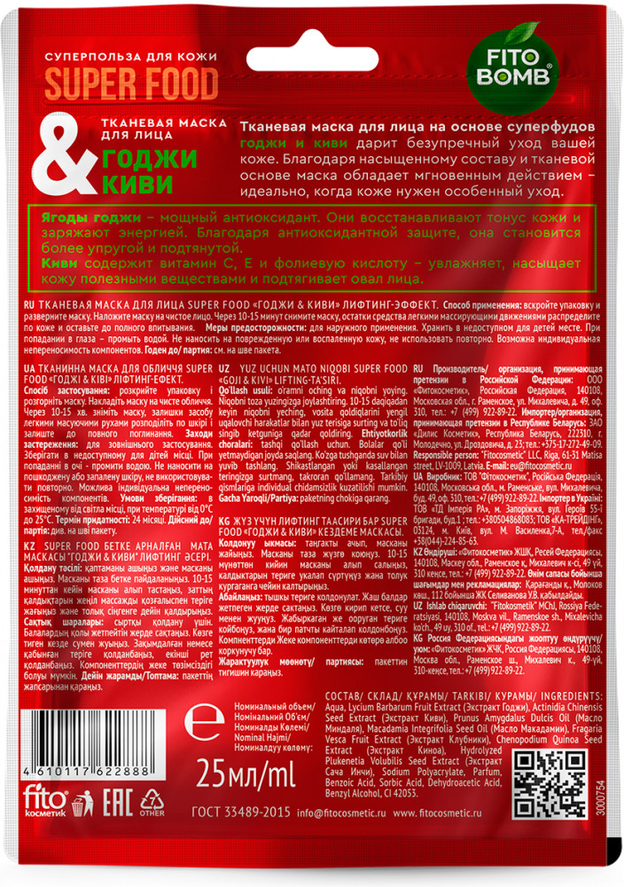 Fito Bomb Маска тканевая для лица с лифтинг-эффектом «Годжи и киви»