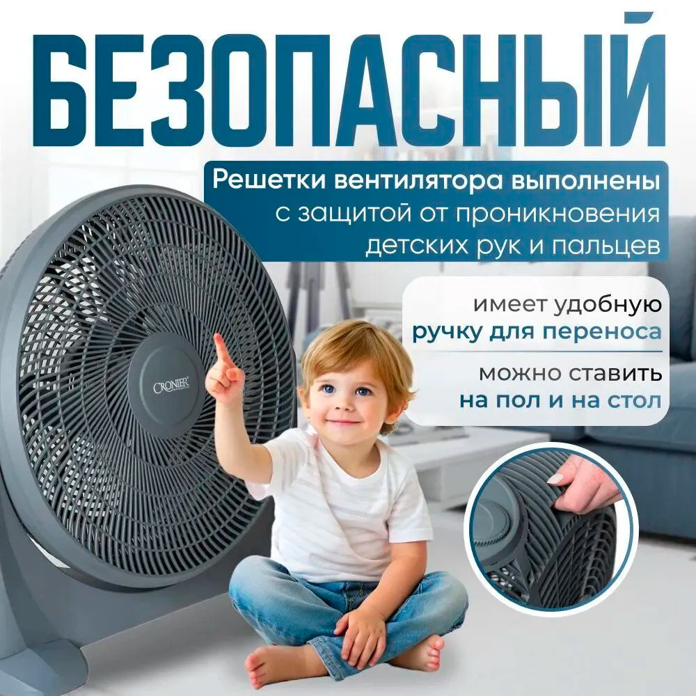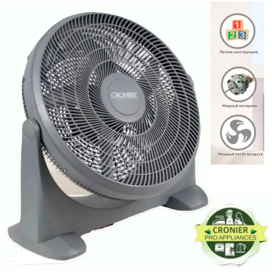 Cronier Вентилятор напольный CR-505В данный момент этот товар отсутствует в продаже. Возможно, у нас найдется аналогичный или похожий товар здесь. Вентилятор напольный Cronier-505 — мощное и стильное решение для борьбы с летней жарой. Он эффективно освежает пространство благодаря двигателю мощностью 100 Вт и 5 лопастям, создающим равномерный поток воздуха. С тремя скоростями вы легко подберёте комфортный режим: от лёгкого бриза до интенсивного охлаждения. Угол наклона 360° позволяет направить воздушный поток в нужную сторону, а длина шнура 1,5 м обеспечивает удобство размещения. Диаметр решётки 50 см гарантирует эффективное проветривание даже просторных помещений. Корпус из прочного РР-пластика делает вентилятор лёгким и долговечным. Подходит для дома, офиса, дачи и любых душных помещений. Cronier-505 — это сочетание мощности, простоты использования, компактности и доступной цены. Почувствуйте настоящую прохладу и комфорт в любую жару! |