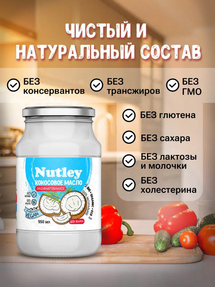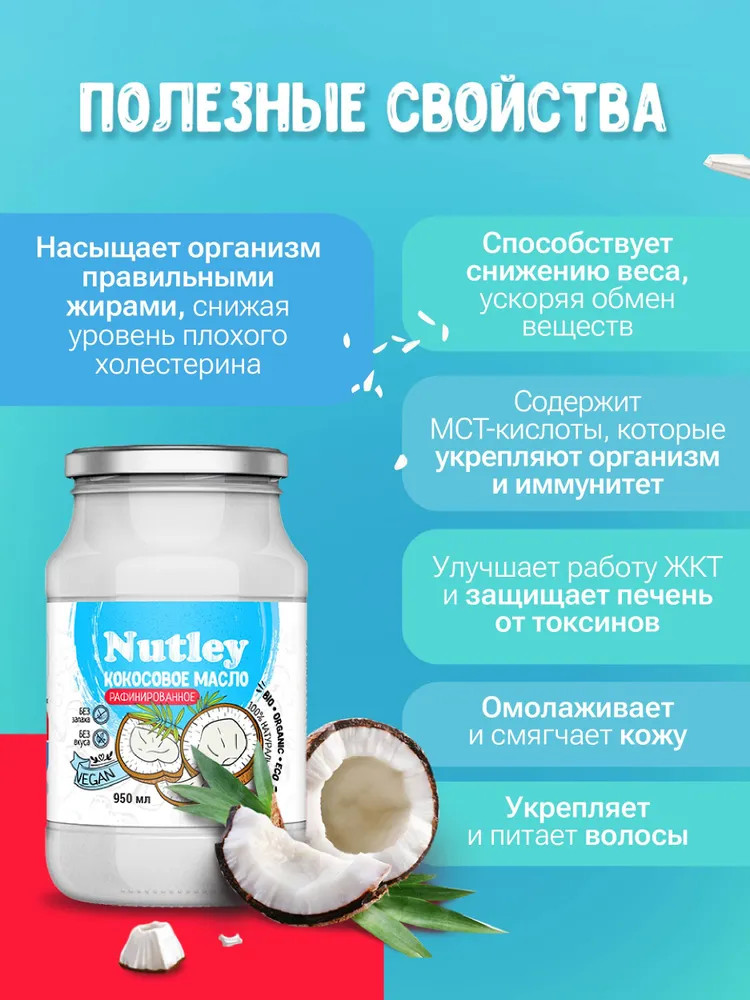 Натуральное кокосовое масло Nutley — это идеальное решение для разнообразия в вашей кухне. Оно обладает неповторимым ароматом и нежной текстурой, которые делают его незаменимым компонентом для приготовления различных блюд. Пищевое масло превосходно подходит для жарки еды и придает блюдам насыщенный вкус и аромат. В умеренных количествах масло кокосовое без глютена оказывает диетическое влияние на массу тела и состав. Оно содержит низкое количество калорий и является прекрасным пп (правильное питание) и зож продуктом для похудения, также подойдет людям, придерживающихся кето (keto) диеты или низкоуглеводного питания. Это масло является не только отличным соусом, но и незаменимым продуктом в бакалеи. Исследования показали, что правильное кокосовое масло предотвращает болезнь Альцгеймера, создавая источник энергии, который поддерживает функцию мозга и улучшает память.