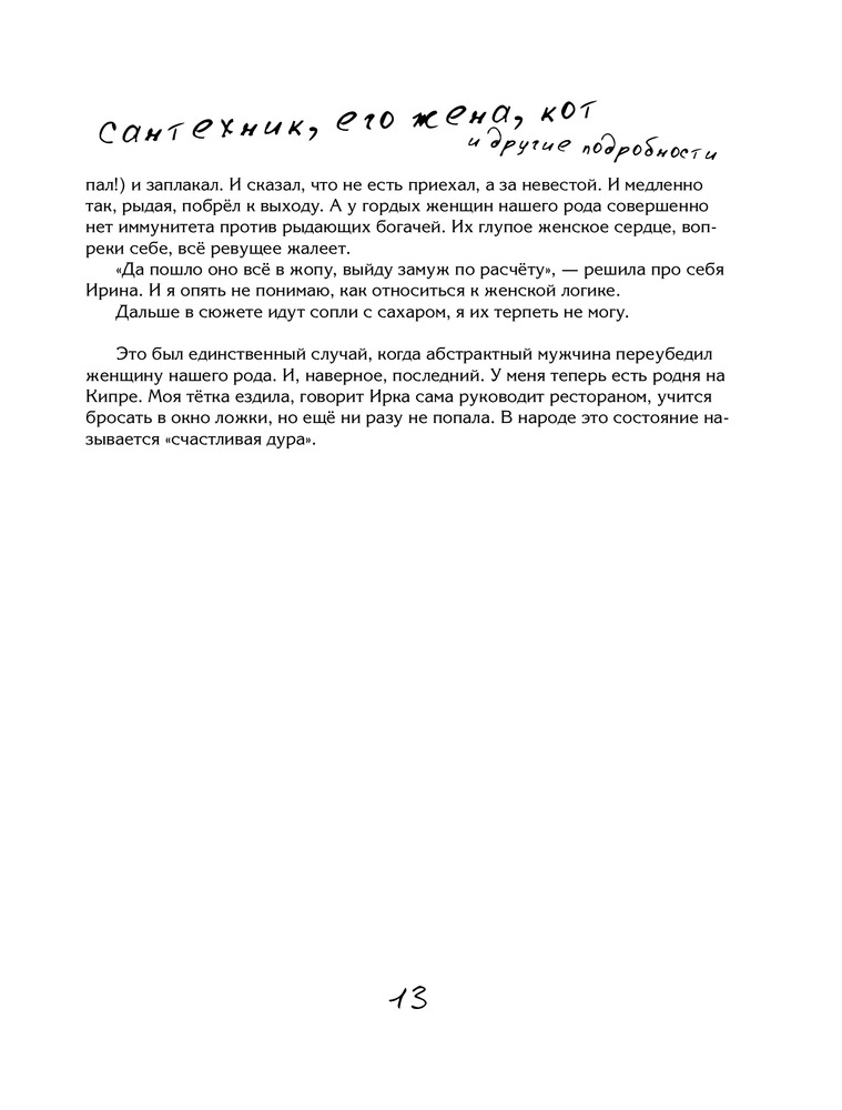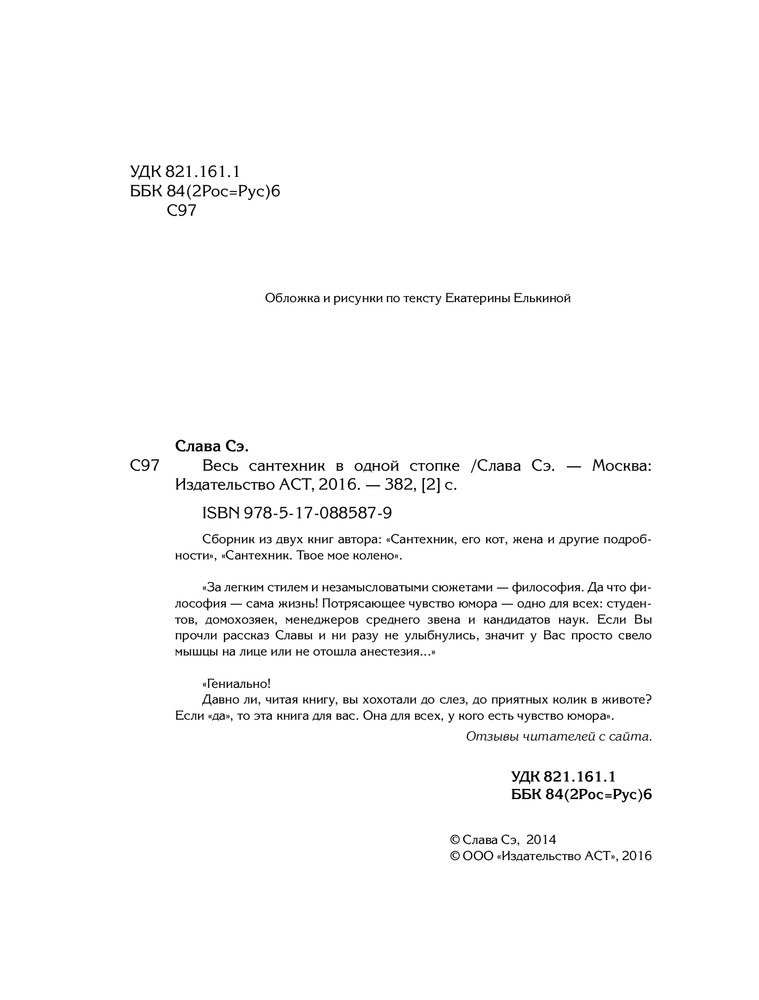 Весь сантехник в одной стопкеВ данный момент этот товар отсутствует в продаже. Возможно, у нас найдется аналогичный или похожий товар здесь. За легким стилем и незамысловатыми сюжетами — философия. Да что философия — сама жизнь! Потрясающее чувство юмора — одно для всех: студентов, домохозяек, менеджеров среднего звена и кандидатов наук. Если вы прочли рассказ Славы и ни разу не улыбнулись, значит у вас просто свело мышцы на лице или не отошла анестезия... Гениально! Давно ли, читая книгу, вы хохотали до слез, до приятных колик в животе? Если «да», то эта книга для вас. Она для всех, у кого есть чувство юмора. |
