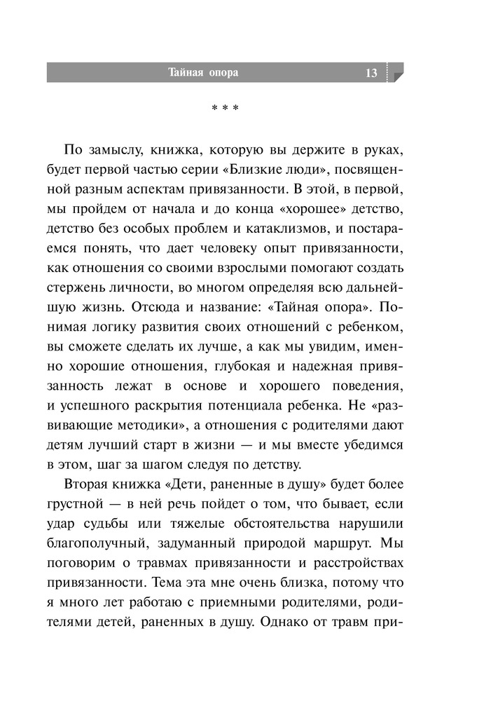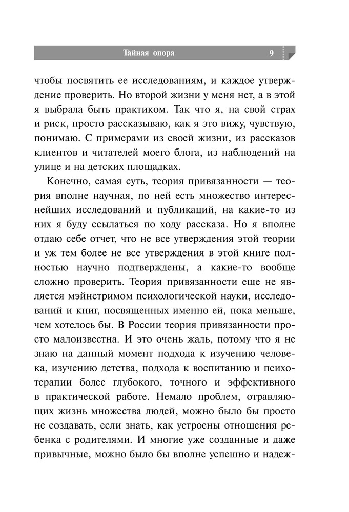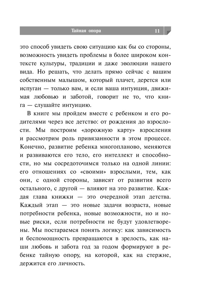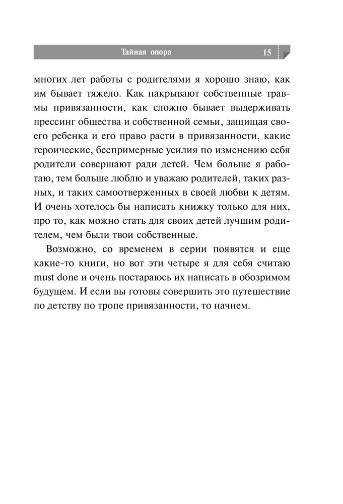 "Тайная опора" - очень нужная книжка для тех у кого есть дети, кто планирует их завести, для дедушек, бабушек и т.д. Вот почему стоит ее купить: 1. читается очень легко; 2. описаны основные этапы психологического развития ребенка; 3. указаны проблемы (кризисы возраста) и способы их преодоления; Конечно, жизнь - это не уравнение с неизвестными, которое можно взять да и решить по формуле, но зная особенности развития ребенка в определенном возрасте, а можно понять (и принять) его поведение, просто как нечто проходящее. Улыбнуться, выдохнуть и сказать себе: ведь дети взрослеют так быстро, что не успеешь оглянуться: вот уже 3, вот уже идем в 1 класс, заканчиваем 9, готовимся к выпускному. Эта книга не для тех, кто ищет алгоритмы устранения капризов и истерик, эта книга для родителей думающих, ищущих и желающих вместе прожить все "кризисы", научиться "контейнеровать" и наконец, стать "своим" взрослым! Очень жалею, что не прочитала эту книгу раньше. Думаю "Тайная опора" будет хорошим подарком подруге или сотруднице, уходящий в декретный отпуск.