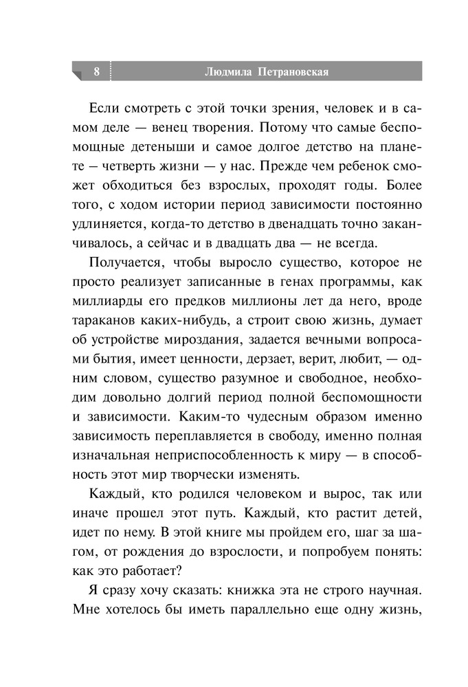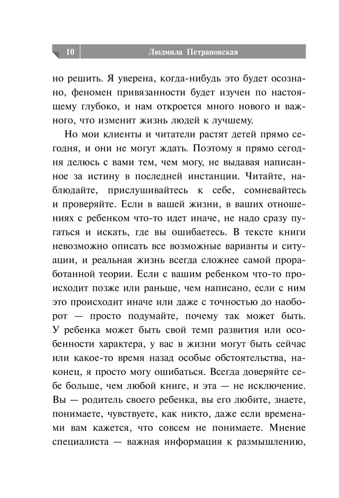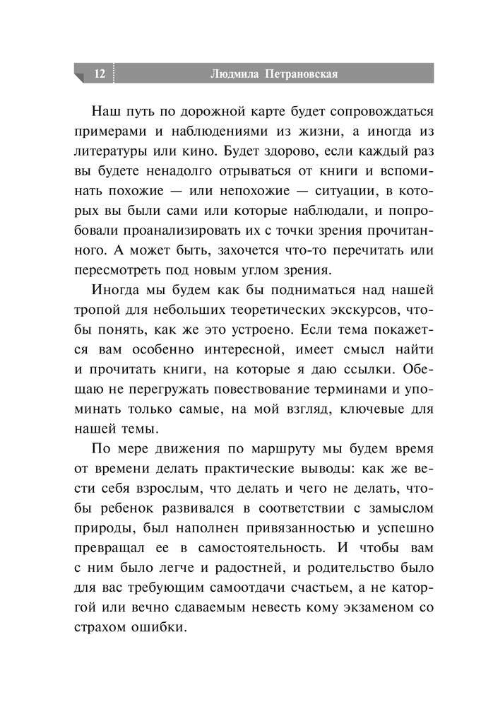 Много читала литературы по психологии детской и взрослой, все больше зарубежных авторов (Это все не про нас- мы другие! Менталитет другой, жизнь и окружение тоже!). Книги Петрановской не попадались. Началось все с "Что делать, если...." купленной сынишке! Написано просто, понятно и интересно, самая суть без непонятных терминов и обобщенных рассуждений! Понравилась мне и ребенку. Эту купила своей старшей дочери (будущей маме). Прочитала сама. Эта книга -шедевр! Не только понятна и полезна, но и за душу берет. Чувствуешь все, что чувствует малыш с рождения и далее. А когда сам чувствуешь, лучше понимаешь своего ребенка, да и своих близких тоже. Рекомендую все книги этого автора!!! Мамам и ПАПАМ! А еще эту книгу нужно дарить каждой беременной женщине!!! Тогда будущее поколение наших детей будет психологически здоровым и сильным, без неврозов! Всем Счастья, мира и покоя!