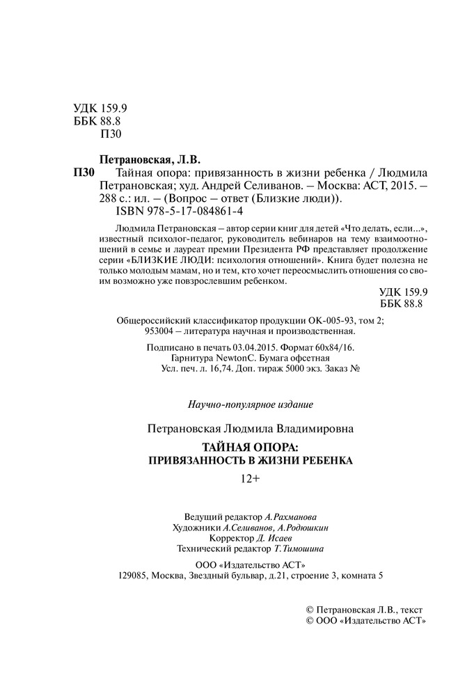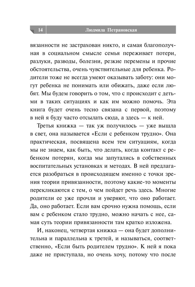 Книги Петрановской рекомендую иметь всем родителям. Иметь эту книгу родителям нужно с самого рождения малыша. Я жалею, что такой книги у меня не было тогда, когда мой старший сын был маленький. Я многого не понимала и кризис трех лет был тяжелым временем для меня и сына. Именно поэтому я рекомендую ее иметь всем с самого начала родительской жизни. Книга рассказывает о привязанности ребенка к матери, о важности которой многие даже не подозревают. Период жизни ребенка разделен по возрастам и описываются подробности взаимоотношений малыша и матери в каждый период/кризис. Книга читается легко, приводиться много примеров из жизни.