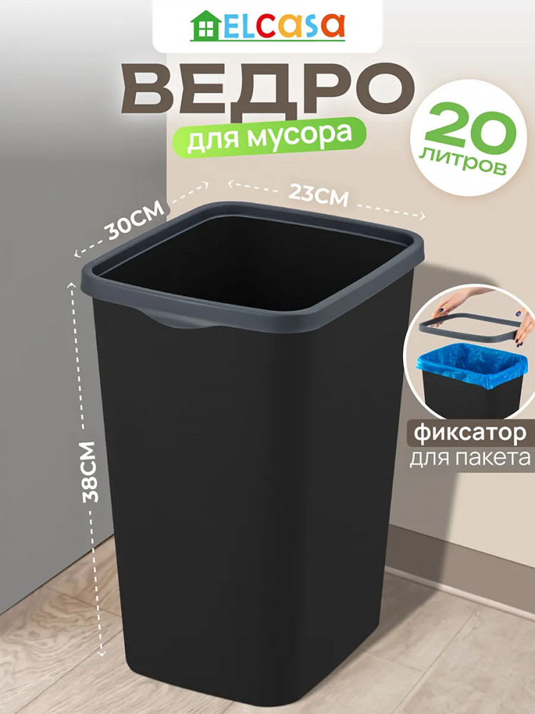 Ведро для мусора с фиксатором El Casa серии «Тандем» объёмом 20 литров поможет поддерживать чистоту в вашем доме, офисе или на улице. Мусорное ведро выполнено из полипропилена. Этот вид пластика считается наиболее безопасным, так как не содержит бисфенол А и не выделяет вредных веществ. Мусорное ведро прямоугольной формы можно разместить в ванной комнате, туалете или на кухне. Удобный держатель в виде ободка помогает зафиксировать мусорный пакет на ведре и не даёт ему сползать.