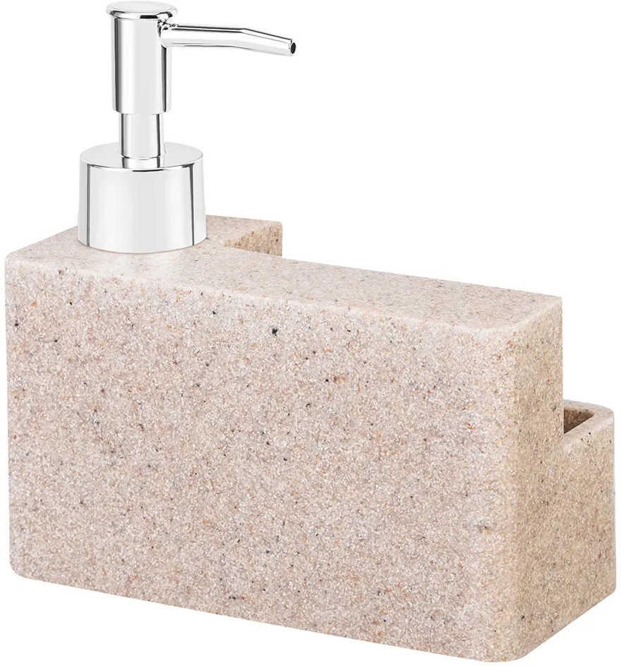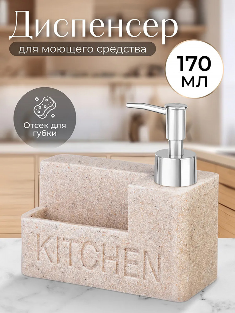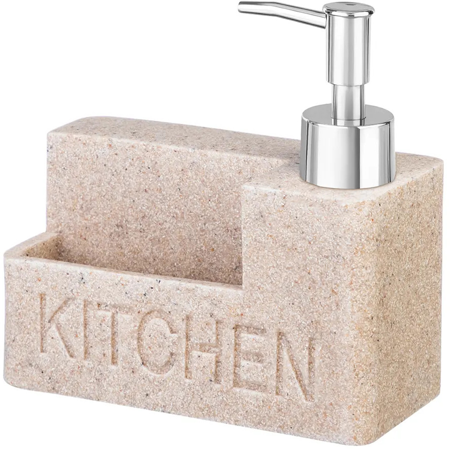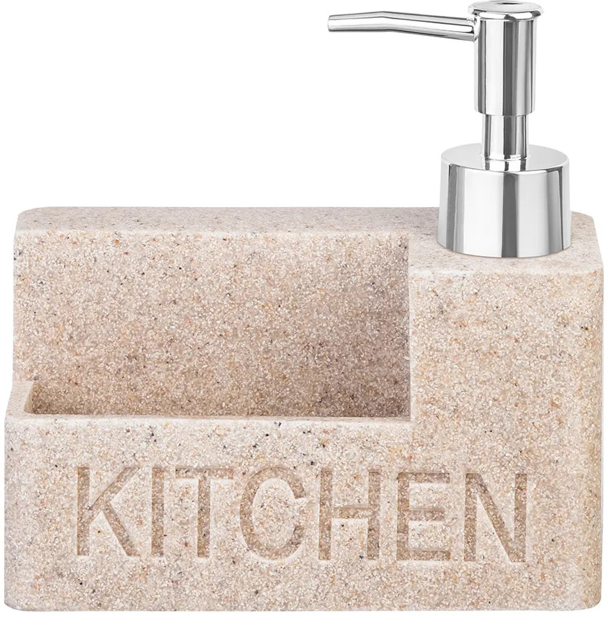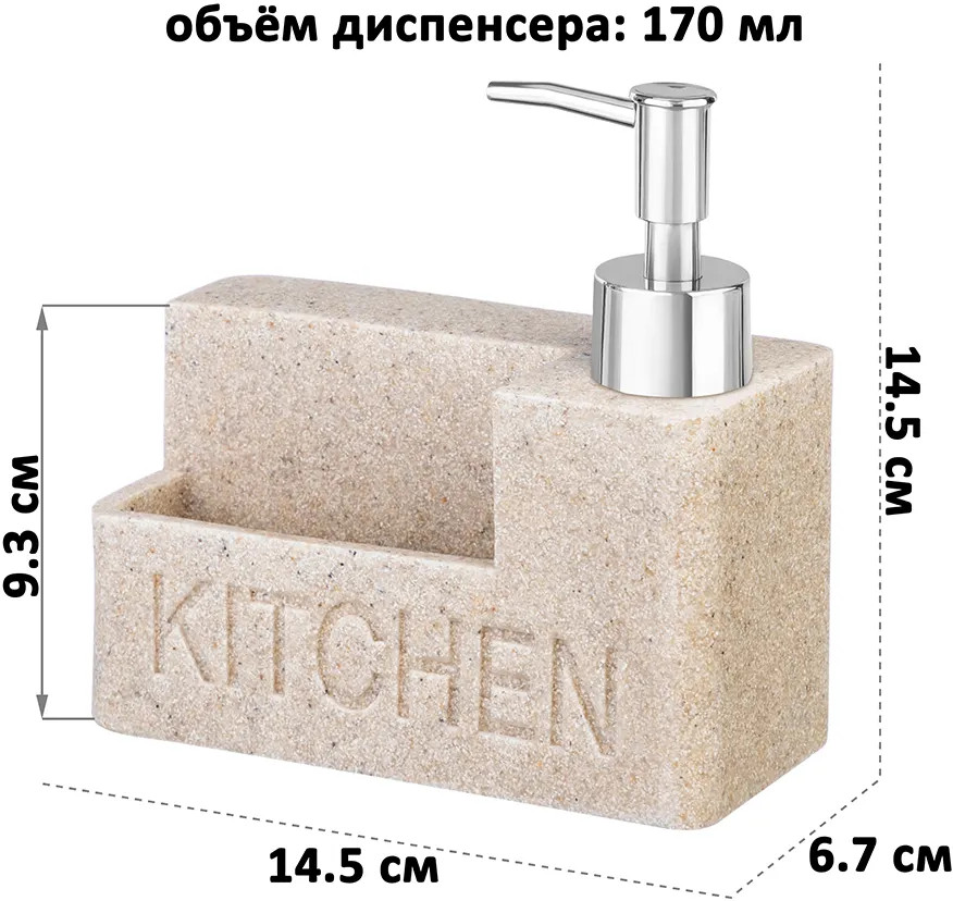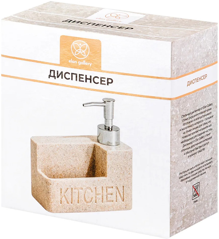 Настольный диспенсер от Elan Gallery подойдёт для хранения жидких моющих и очищающих средств. Размер изделия — 14,5×6,7×14,5 см, объём — 170 мл. Высота без дозатора — 9,3 см. Выполнен из полирезина — современного материала, отличающегося лёгкостью и устойчивостью к влаге. Он не выделяет вредных веществ и не впитывает посторонние запахи. Благодаря высокой прочности изделие надолго сохранит привлекательный внешний вид. На бежевую поверхность с песочной текстурой нанесена впалая рельефная надпись «Kitchen» — «Кухня». Дозатор серебристого цвета выполнен из пластика. Он герметичен и надёжно предотвращает проливание.