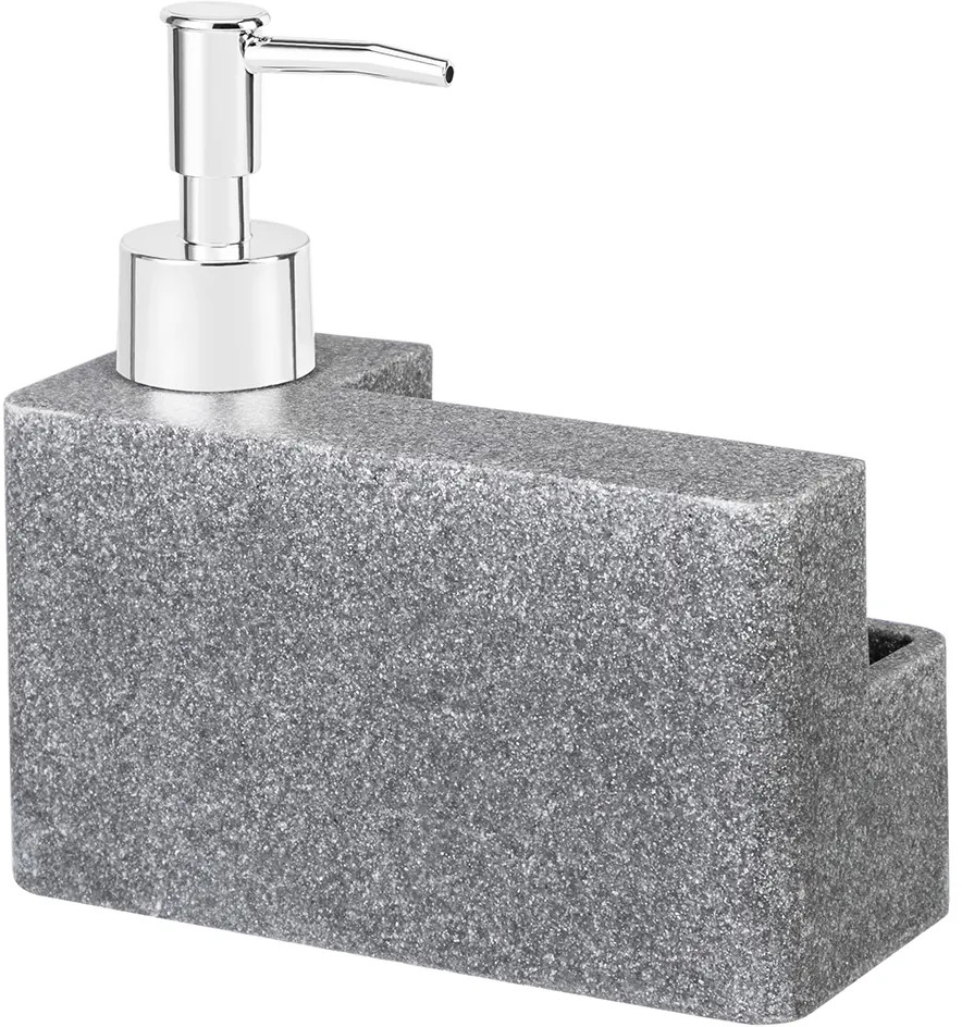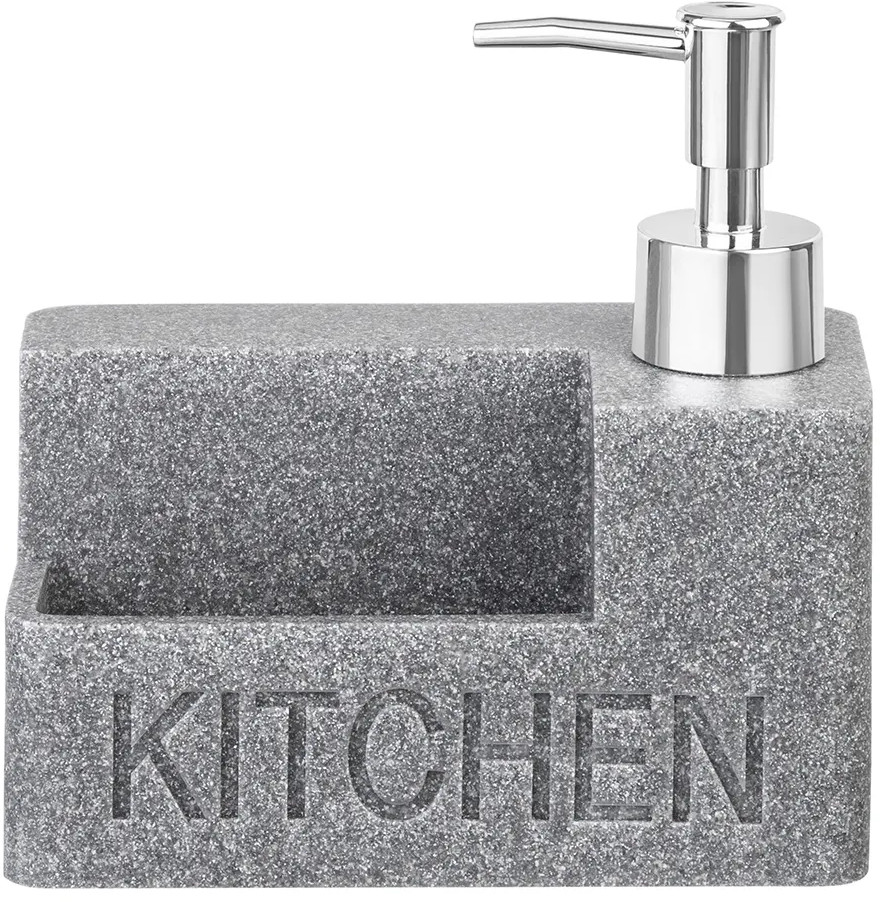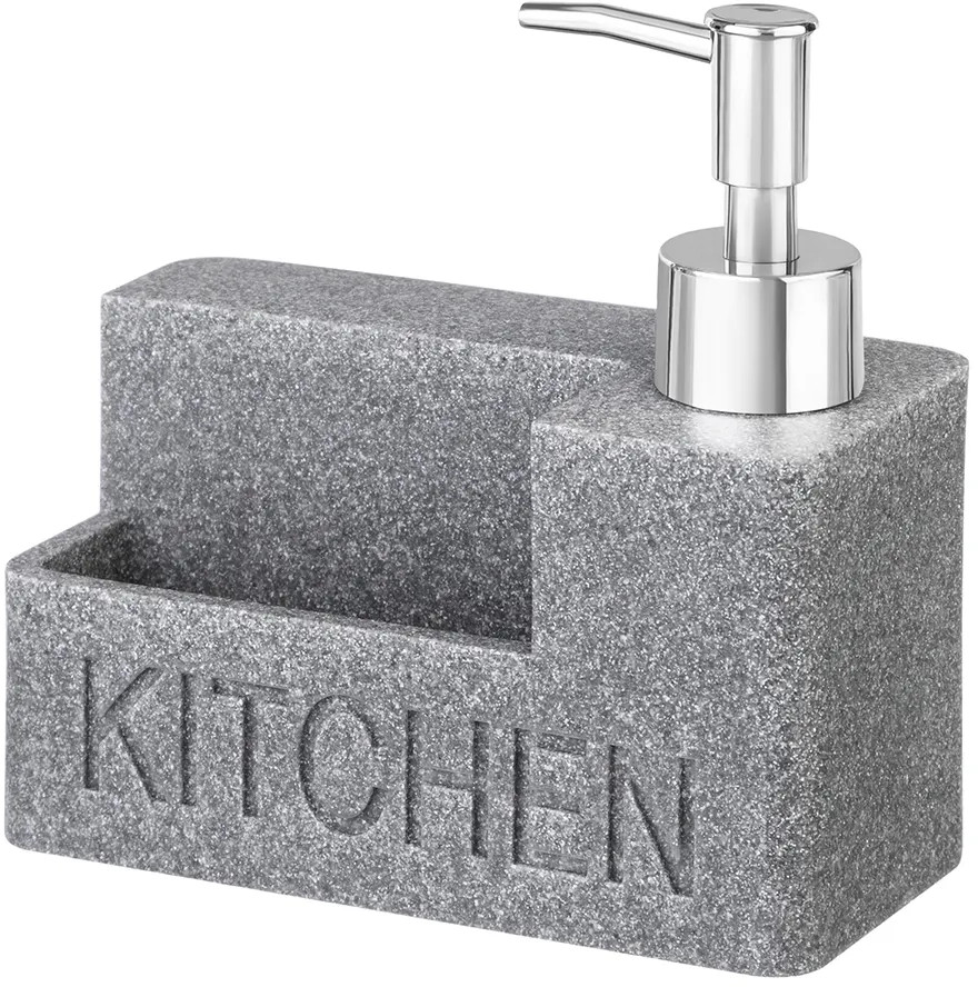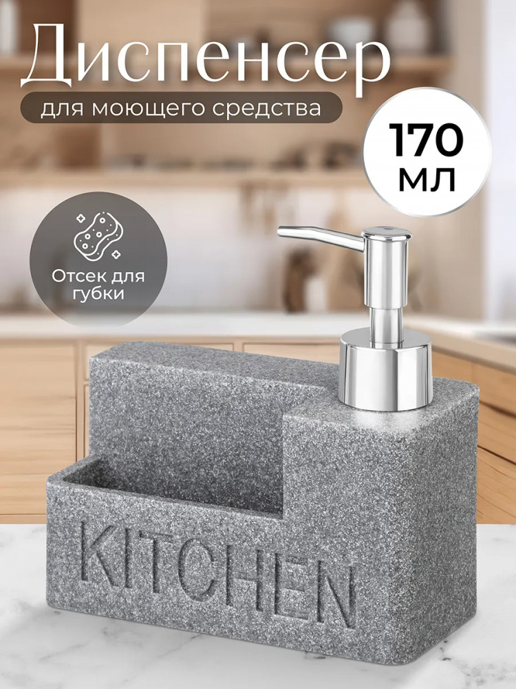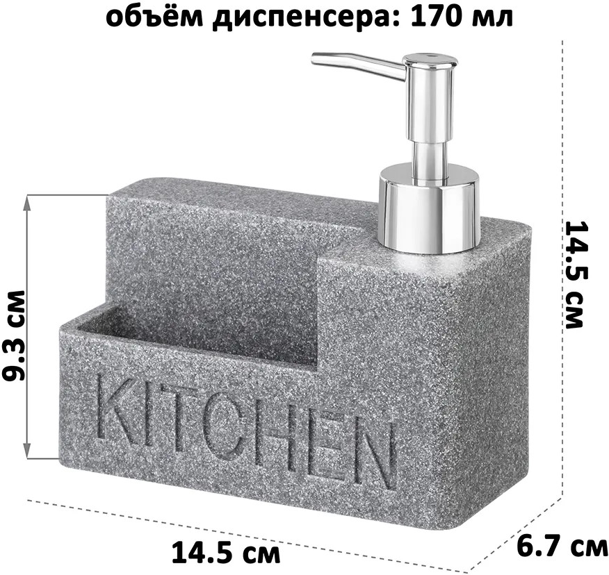 Настольный диспенсер от Elan Gallery подойдёт для хранения жидких моющих и очищающих средств. Размер изделия — 14,5×6,7×14,5 см, объём — 170 мл. Высота без дозатора — 9,3 см. Выполнен из полирезина — современного материала, отличающегося лёгкостью и устойчивостью к влаге. Он не выделяет вредных веществ и не впитывает посторонние запахи. Благодаря высокой прочности изделие надолго сохранит привлекательный внешний вид. На бежевую поверхность с песочной текстурой нанесена впалая рельефная надпись «Kitchen» — «Кухня». Дозатор серебристого цвета выполнен из пластика. Он герметичен и надёжно предотвращает проливание.