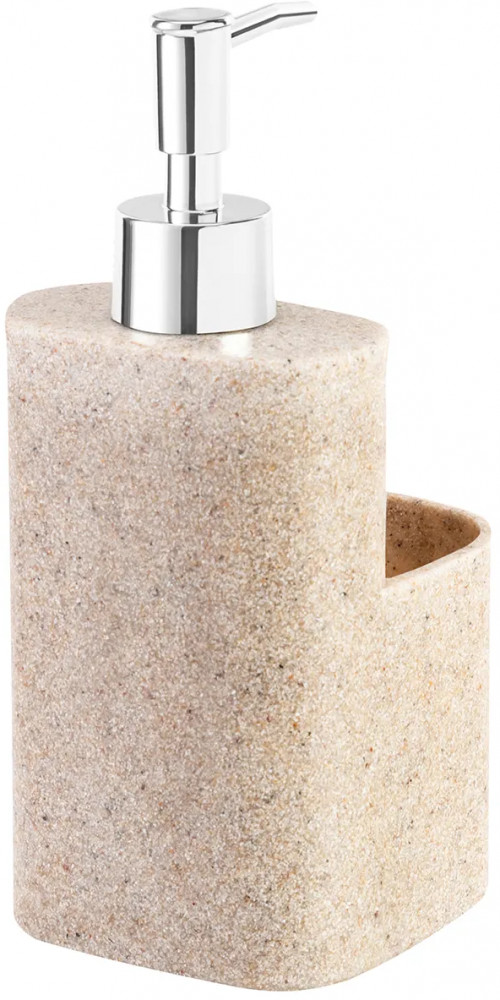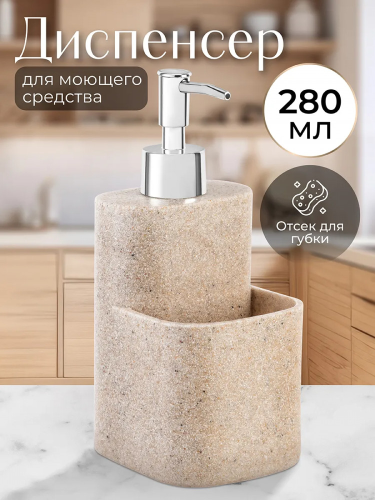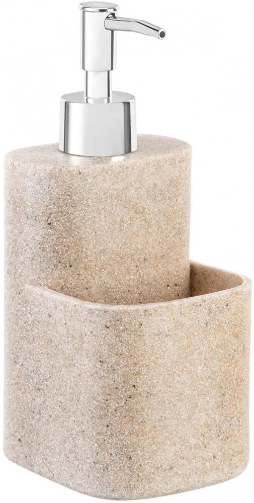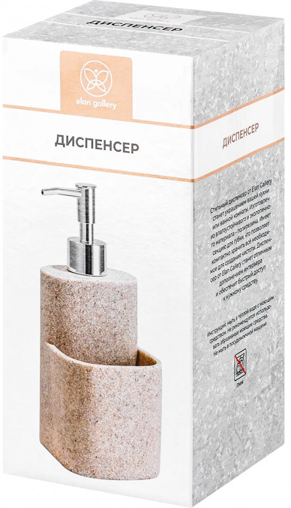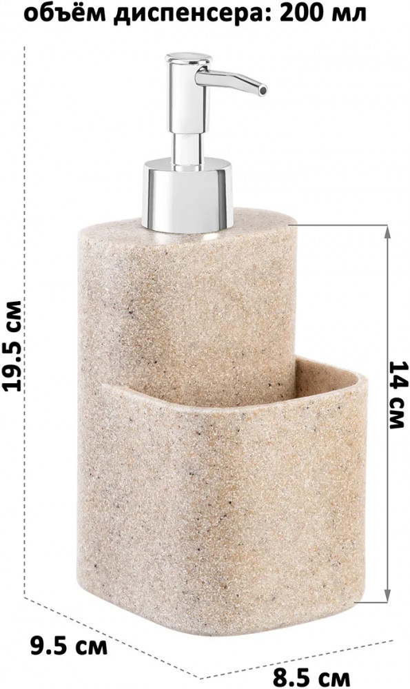 Настольный диспенсер от Elan Gallery подойдёт для хранения жидких моющих и очищающих средств. Размер изделия — 8,5×9,5×19,5 см, объём — 280 мл. Высота без дозатора — 14 см. Выполнен из полирезина — современного материала, отличающегося лёгкостью и устойчивостью к влаге. Он не выделяет вредных веществ и не впитывает посторонние запахи. Благодаря высокой прочности изделие надолго сохранит привлекательный внешний вид. Бежевая поверхность имеет песочный эффект. Дозатор серебристого цвета выполнен из пластика. Он герметичен и надёжно предотвращает проливание.