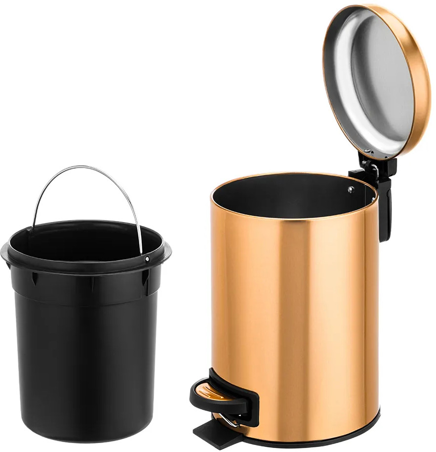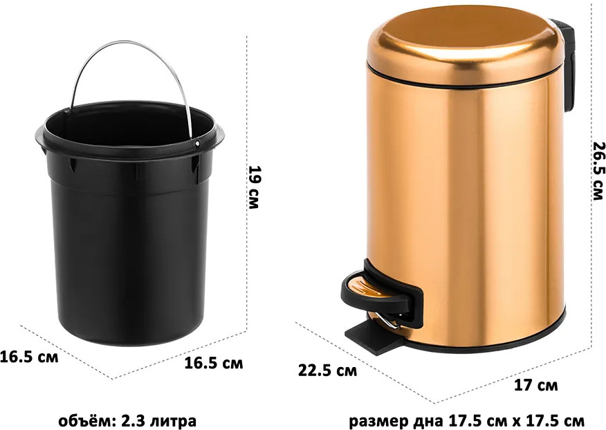 💳 Оплатить за товар можно при получении 🇰🇿 Есть бесплатная доставка по Казахстану от 1 дня 🎁 Копите бонусы с каждой покупки Контейнер для мусора с педалью от бренда El Casa бронзового цвета предназначен для организации порядка в вашем доме, например, в комнате или на кухне. Урна оснащена крышкой. Крышка не пропустит запахов и не допустит выпадения мусора. Размер изделия — 22,5×17×26,5 см, объём — 3 литра. Высота с открытой крышкой 43 см. Внешняя ёмкость бронзового цвета выполнена из металла, имеет внутри чёрное пластиковое ведро размером 16,5×16,5×19 см и объёмом 2,6 литра. У внутреннего ведёрка есть ручка. Крышечка открывается педальным механизмом. Педаль легко нажать — вам не потребуется прикладывать усилий. |