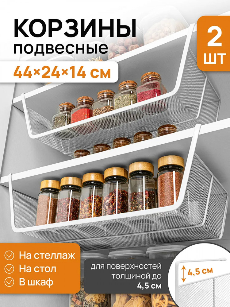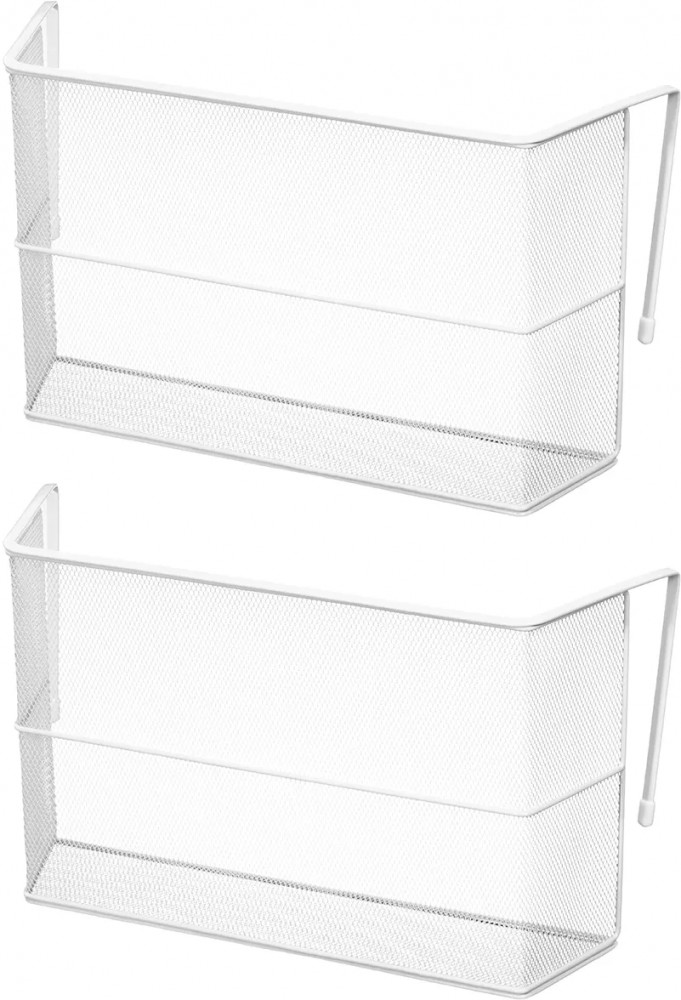 Набор 2 подвесных корзин белого цвета от бренда El Casa — это компактная система для создания порядка в любом уголке вашего дома: комнате, гардеробной или на кухне. Просто прикрепите органайзер на горизонтальную поверхность, чтобы сделать дополнительную полочку без сверления и сложных крепежей. Размер каждой корзины — 44×24×14 см, её дна — 34,5×24,5 см, максимальная нагрузка на 1 корзинку — 5 кг. Контейнеры выполнены из прочной металлической сетки с пудровым покрытием и легко крепятся к полке или крышке стола толщиной не более 4,5 см. Металл в составе обеспечивает долговечность использования, надежно выдерживает вес книг и журналов.