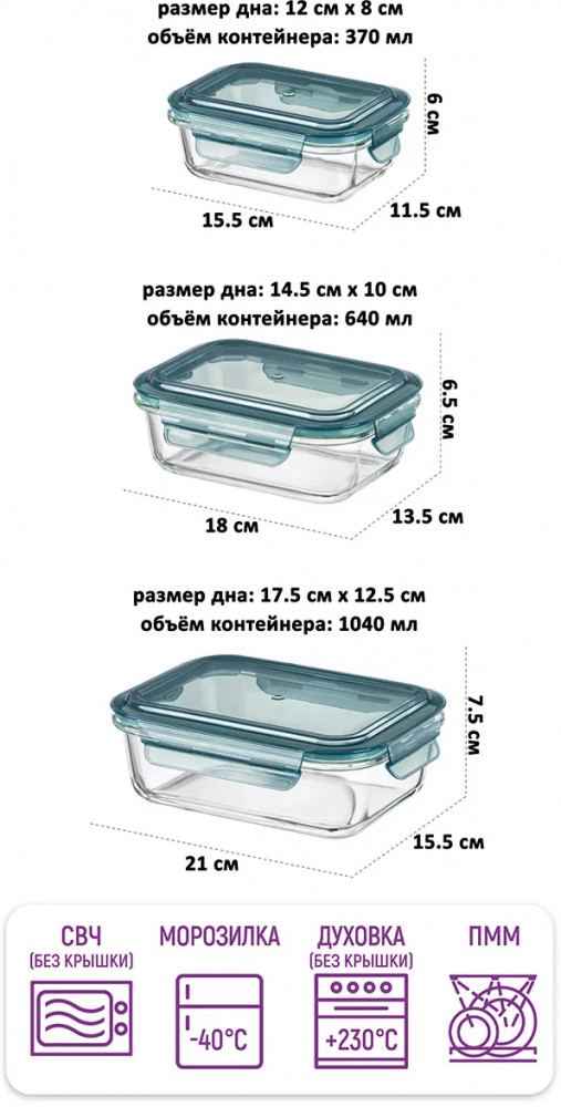 Изготовлены из жаропрочного боросиликатного стекла, обладающего термостойкостью и не впитывающего запахи. Крышки выполнены из пластика, оснащены силиконовыми уплотнителями и 4-мя защёлками. Их герметичность надёжно предотвращает проливание жидкостей, благодаря чему контейнеры послужат в качестве суповых. Прозрачные стенки позволят следить за количеством содержимого, что облегчает организацию пространства в холодильнике. Стеклянные лотки будут отличным ланч-боксом для обеда в школе или на работе в офисе. В них удобно хранить салат, суп, сыпучие продукты и крупы, а также бутерброды. Благодаря термостойкому стеклу их можно использовать для заморозки продуктов в морозильной камере, без крышек — для запекания в духовке. Универсальный кухонный инвентарь можно использовать в качестве салатника, а также для хранения овощей, фруктов, зелени и десертов. Он станет незаменимым элементом любого пикника.