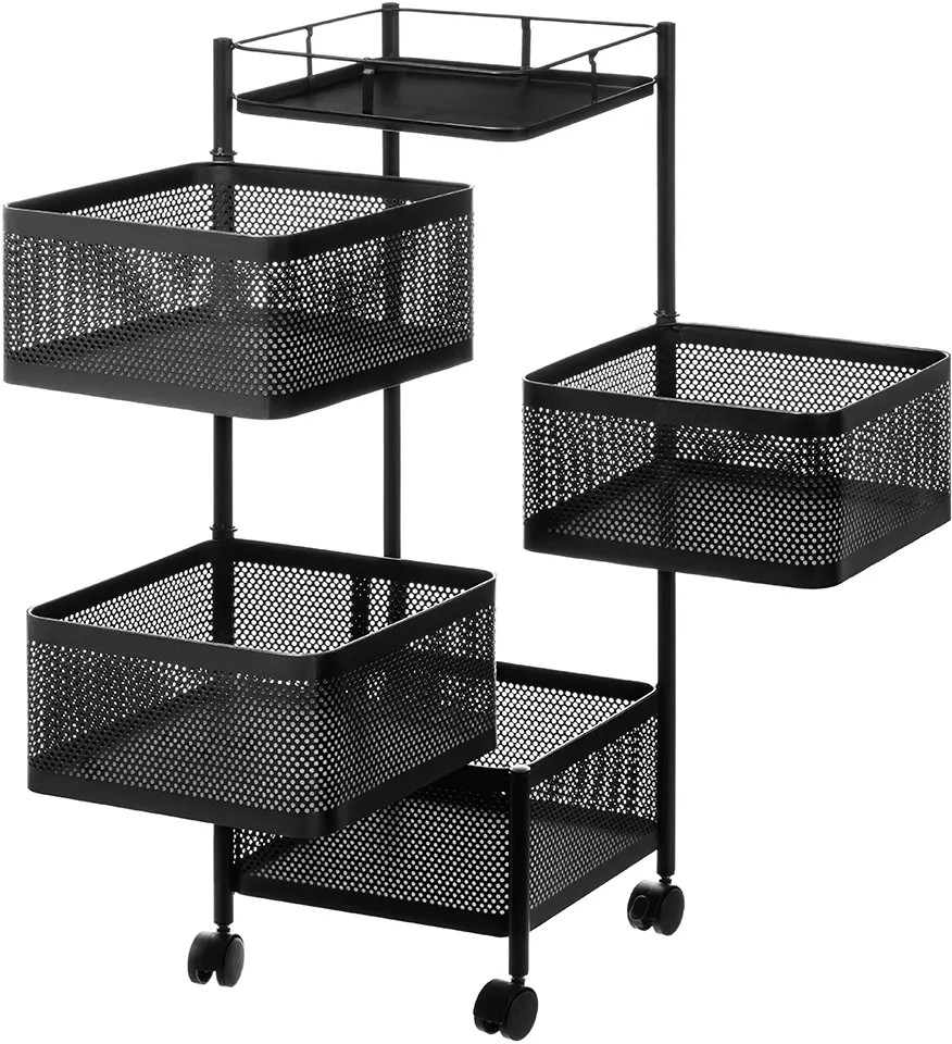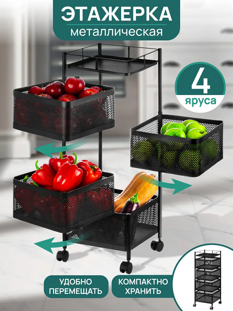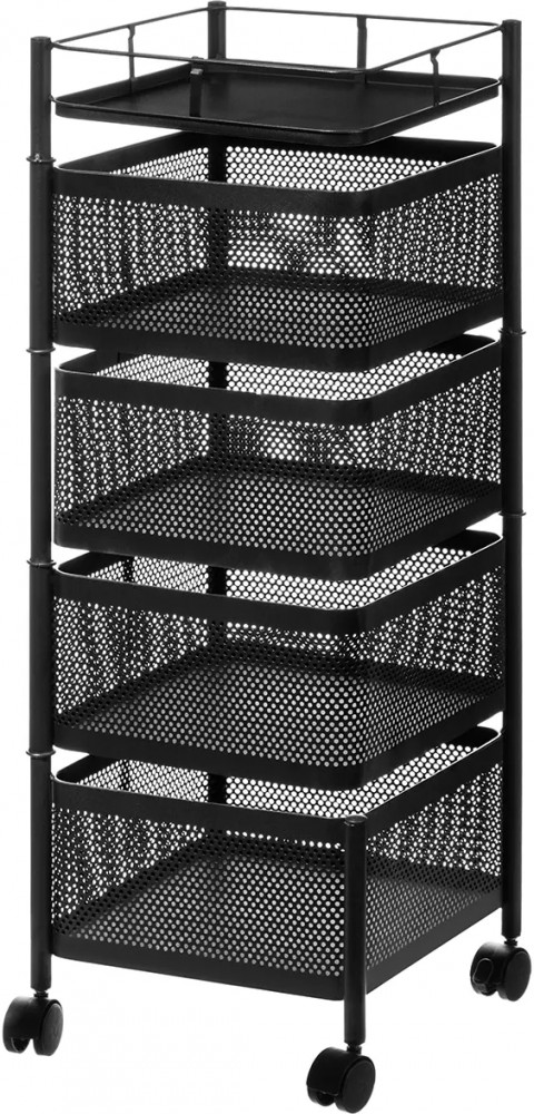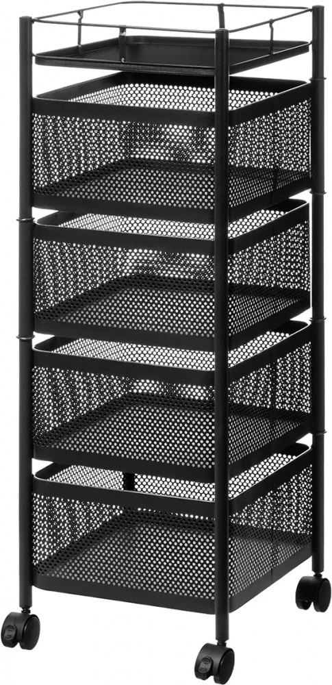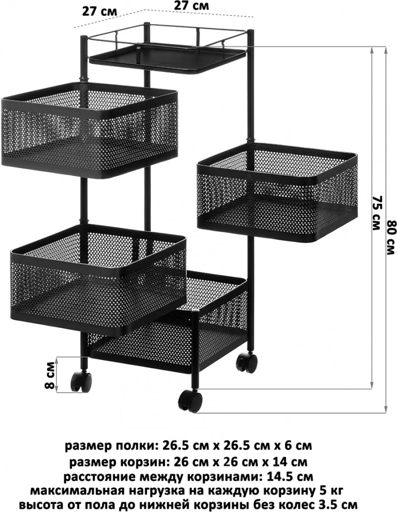 Четырёхъярусная этажерка El Casa размером 27×27×80 см на 4 колесах поможет создать порядок и организовать систему хранения в вашем доме. Размер этажерки без колесиков 27×27×75 см. Выполнена из металла. Размер каждого прямоугольного ящичка — 26×26×14 см, расстояние между ящиками — 2 см. Максимальная нагрузка на одну полочку — 5 кг. Высота от пола до нижней корзины без колес 3 см, с колесами — 7,5 см. Квадратные отсеки вращаются вокруг оси. Благодаря колесикам стеллаж с полочками удобно перемещать из одной комнаты в другую. Система тормоза в виде фиксаторов на 2 колесах позволит устойчиво закрепить положение этажерки в нужном месте.