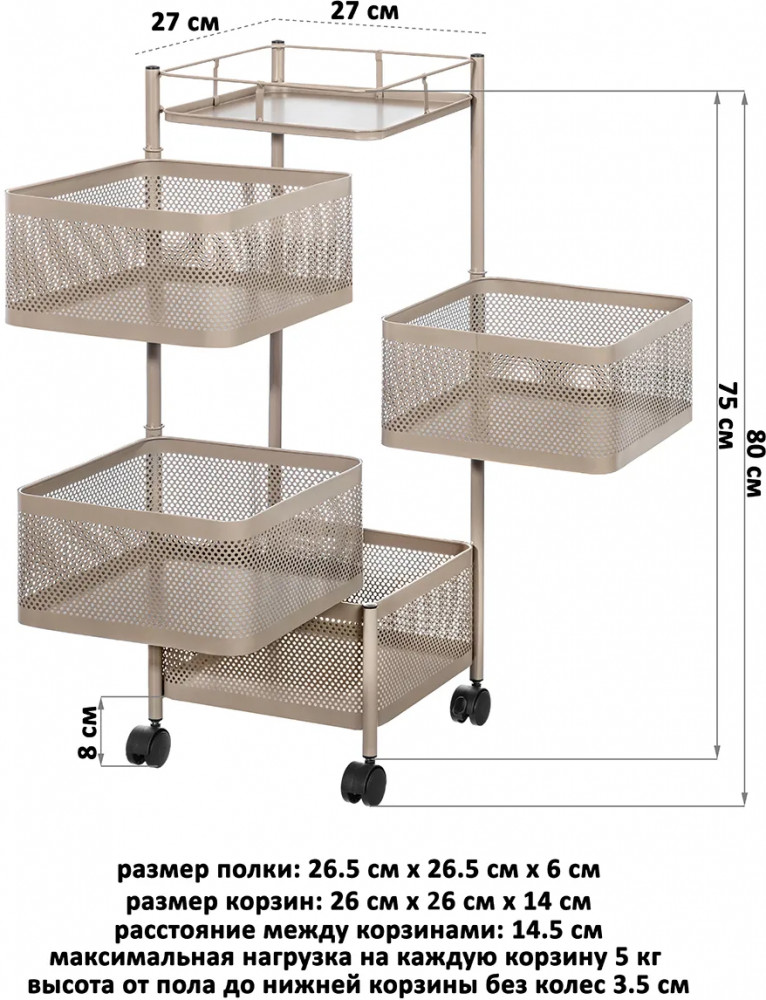 Четырёхъярусная этажерка El Casa размером 27×27×80 см на 4 колесах поможет создать порядок и организовать систему хранения в вашем доме. Размер этажерки без колесиков 27×27×75 см. Выполнена из металла. Размер каждого прямоугольного ящичка — 26×26×14 см, расстояние между ящиками — 2 см. Максимальная нагрузка на одну полочку — 5 кг. Высота от пола до нижней корзины без колес 3 см, с колесами — 7,5 см. Квадратные отсеки вращаются вокруг оси. Благодаря колесикам стеллаж с полочками удобно перемещать из одной комнаты в другую. Система тормоза в виде фиксаторов на 2 колесах позволит устойчиво закрепить положение этажерки в нужном месте.