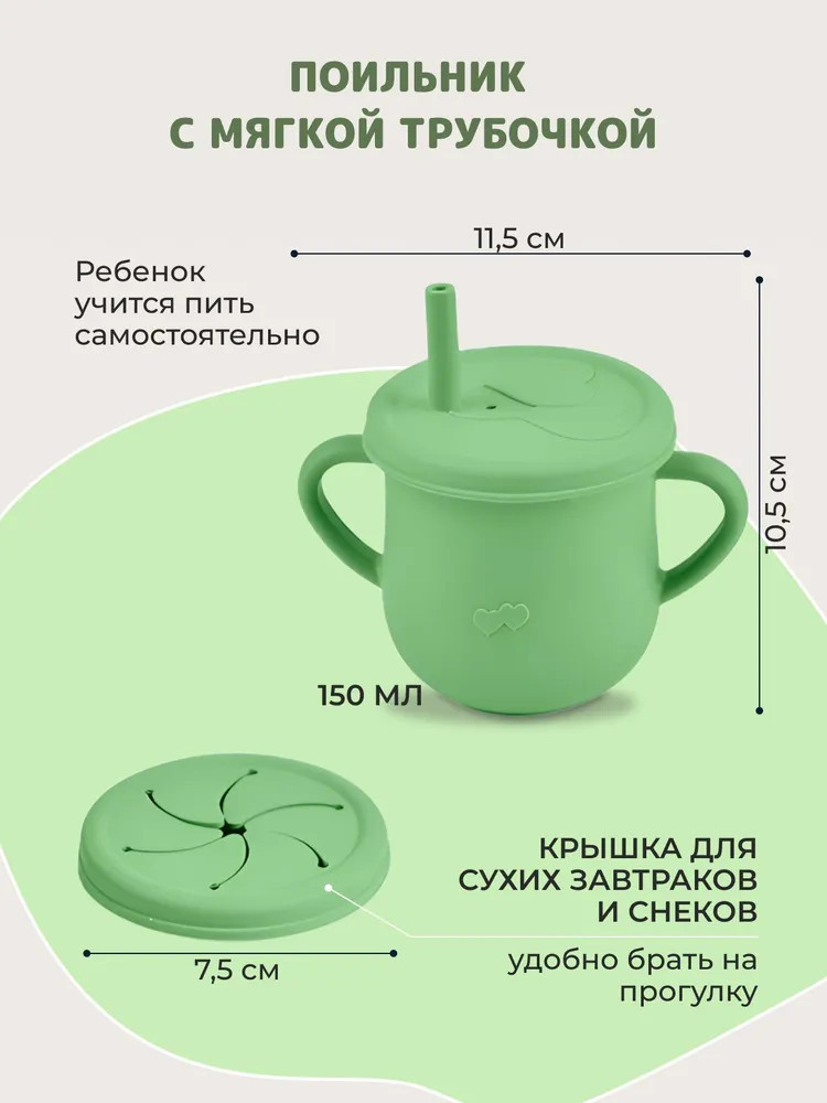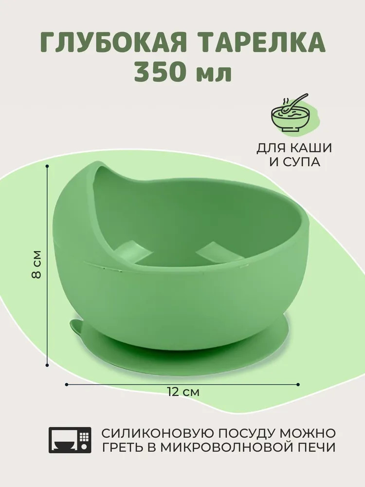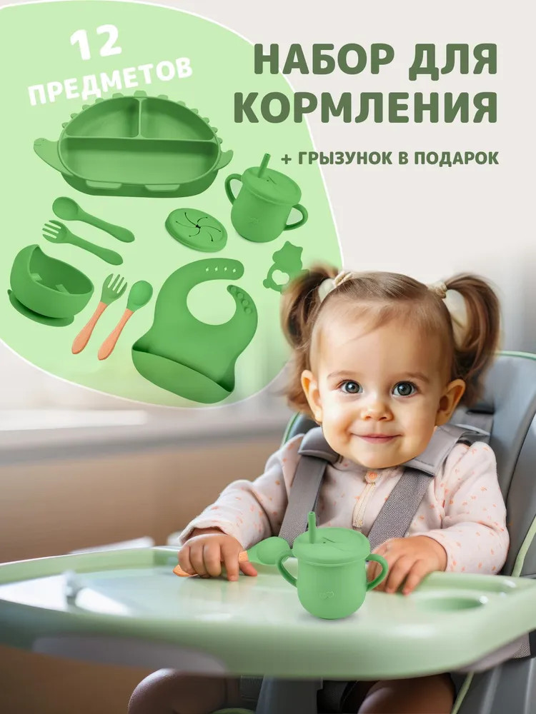 В данный момент этот товар отсутствует в продаже. Возможно, у нас найдется аналогичный или похожий товар здесь. Силиконовый набор посуды идеален для первого прикорма и подойдет детям от 4 месяцев до 7 лет. Набор включает из 12 предметов: поильник, крышка для поильника и съемная трубочка, дополнительная крышка на поильник для сухих завтраков и снеков, тарелка с тремя секциями на присоске, глубокая тарелка, нагрудник с кармашком, вилка и ложка с деревянными ручками, полностью силиконовые вилка и ложка, прорезыватель (в подарок).