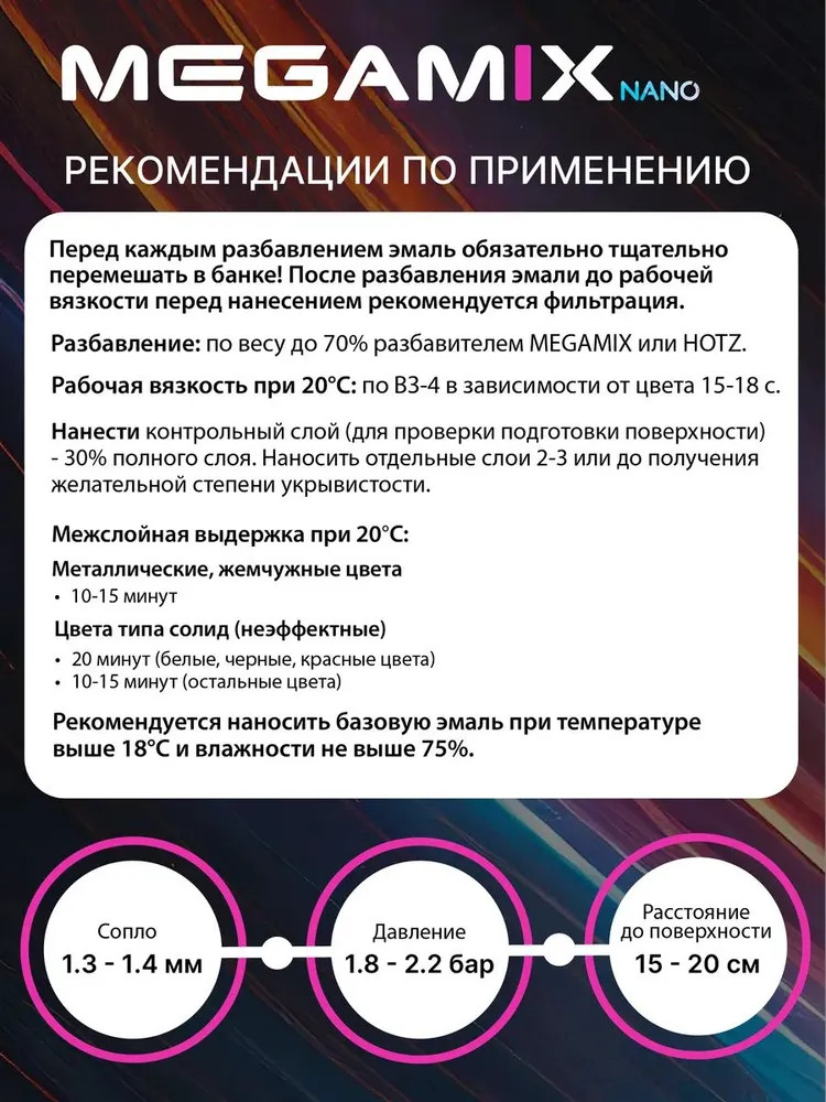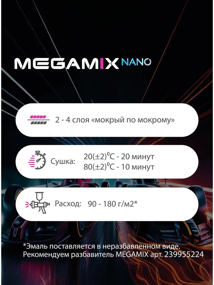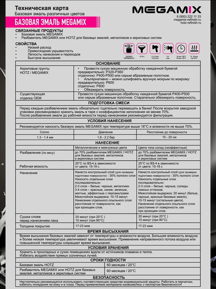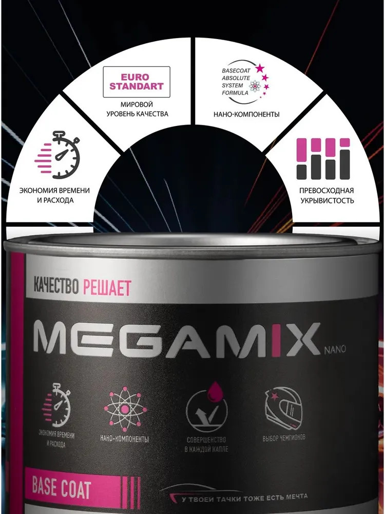 Готовая базисная эмаль MegaMix применяется в 2-х-слойных системах покрытия (база + лак) для ремонта легковых иномарок, отделочной окраски кузовов автобусов, грузовиков, а также окраски различных пластиковых и металлических предметов. Автоэмаль обладает хорошей укрывающей способностью, легка и удобна в применении. Авто эмаль может использоваться как для локального ремонта машины, так и для полной окраски кузова автомобиля. После нанесения прозрачных лаков получается блестящее, прочное, стойкое к атмосферным и другим воздействиям лакокрасочное покрытие. Готовая автомобильная эмаль поставляется в неразбавленном виде. При подготовке к нанесению эмали необходимо разбавить до рабочего состояния оригинальным разбавителем MegaMix для металликов.