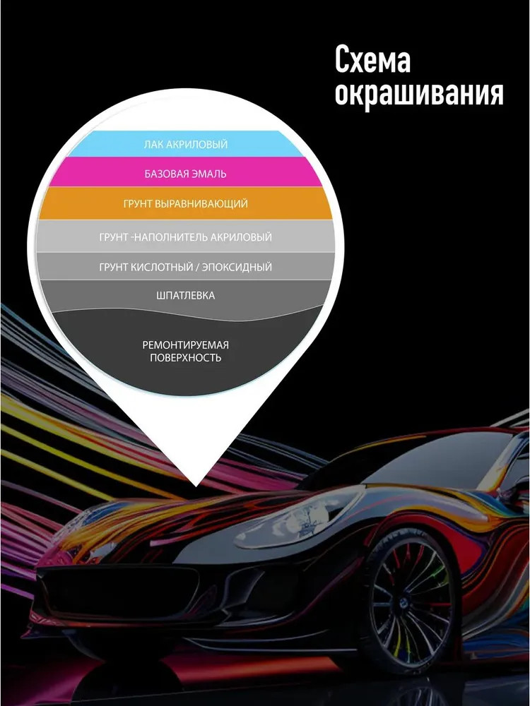 3. Наносить на предварительно загрунтованные и отшлифованные поверхности в 2-4 слоя мокрый по мокрому, с выдержкой между слоями 10-15 минут и сушкой последнего слоя 15-20 минут при температуре 20 градусов по Цельсию. Дюза 1.3 — 1.4 мм, давление 1.8 — 2.2 бар;