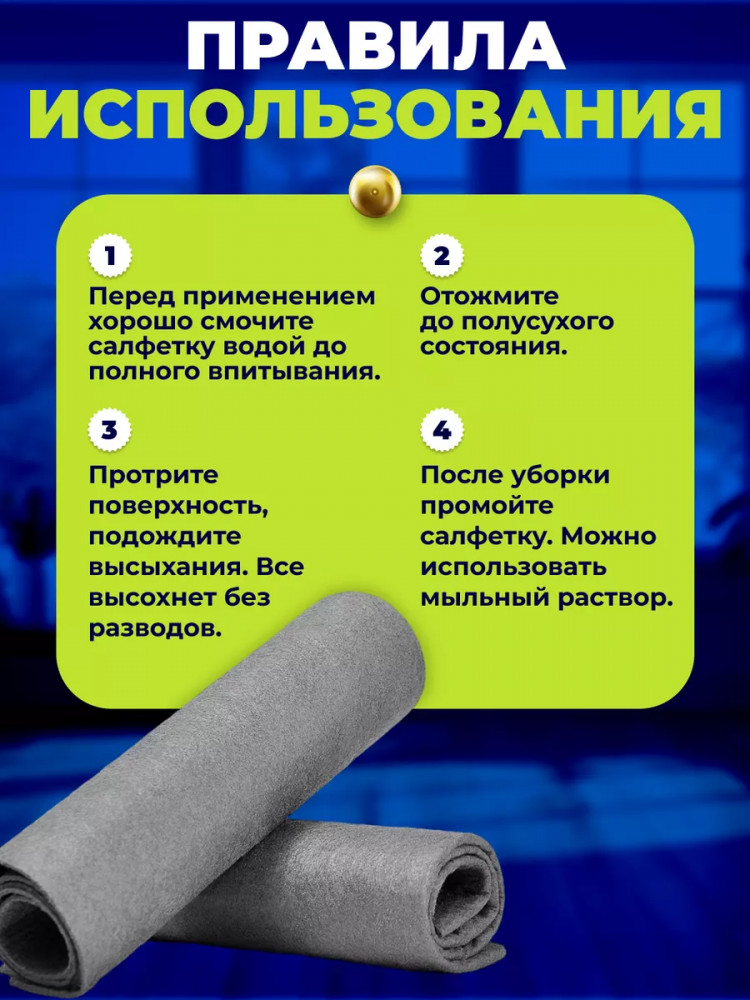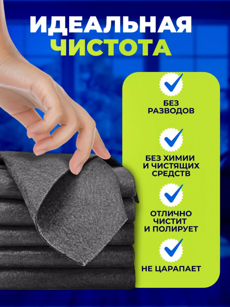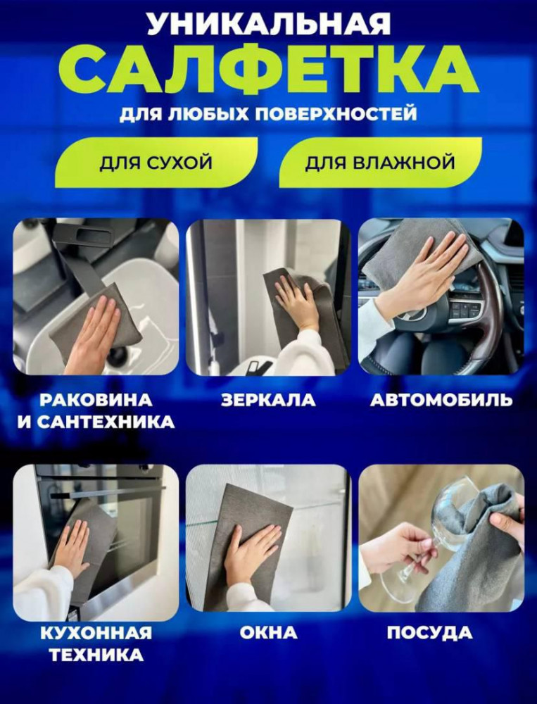 Благодаря уникальной структуре волокна, салфетка притягивает пыль и удаляет загрязнения, не требуя дополнительных чистящих средств. Её можно использовать как для влажной, так и для сухой уборки, дома, на даче, в офисе и автомобиле. Легко справляется с жировыми пятнами, отпечатками пальцев, загрязнениями на экранах телефонов, ноутбуков, телевизоров и других гаджетов. Подходит даже для деликатной очистки очков и техники.
