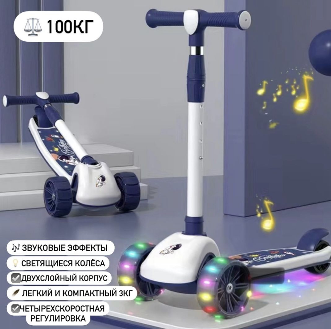 Самокат детский о световыми и звуковыми эффектами «Синий Шторм»-10% +169