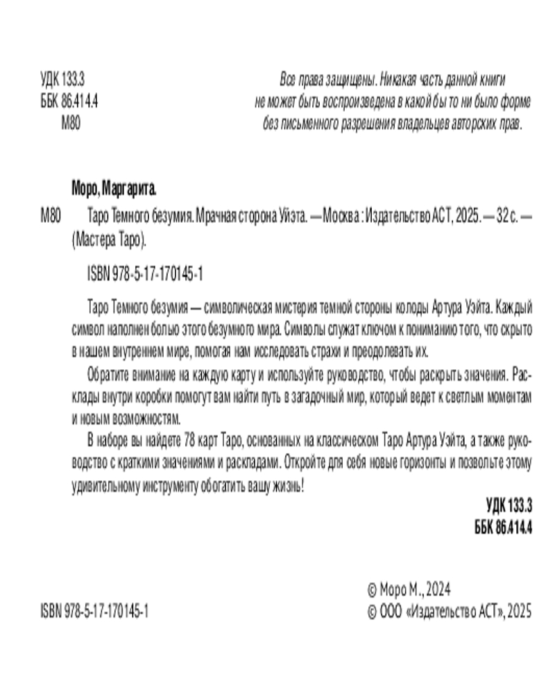 💳 Оплатить за товар можно при получении 🇰🇿 Есть бесплатная доставка по Казахстану от 1 дня 🎁 Копите бонусы с каждой покупки Серия: Мастера Таро (Коробка с картами + руководство) Символическая мистерия темной стороны колоды Артура Уэйта — Таро Темного безумия от оккультистки Маргариты Моро. Каждый символ наполнен болью этого безумного мира. Символы на картах — ключи к пониманию того, что скрыто в нашем внутреннем мире, помощники в исследовании страхов и их преодолении. Используйте руководство, чтобы узнать краткое значение карт. Расклады внутри коробки подскажут верный путь в загадочный мир ночных кошмаров, что ведет к беспечному утру. В коробке вы найдете колоду из 78 карт на основе Таро Артура Уэйта и руководство с краткими значениями и раскладами. |
