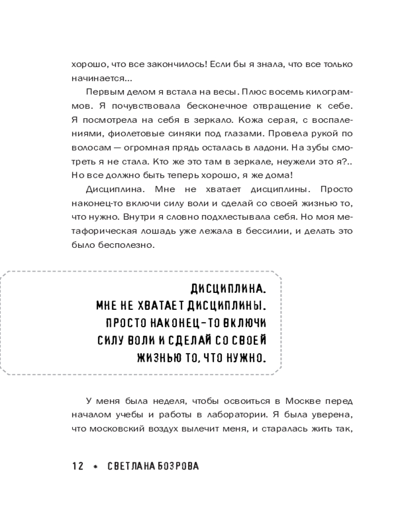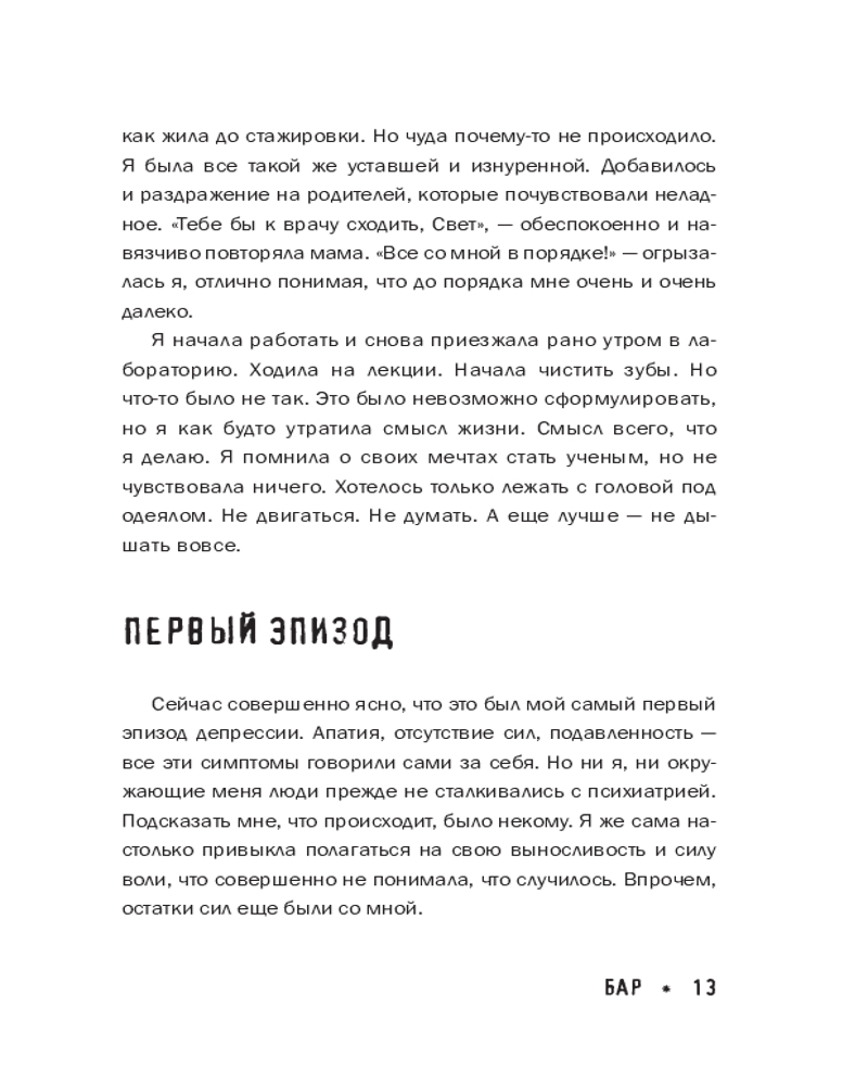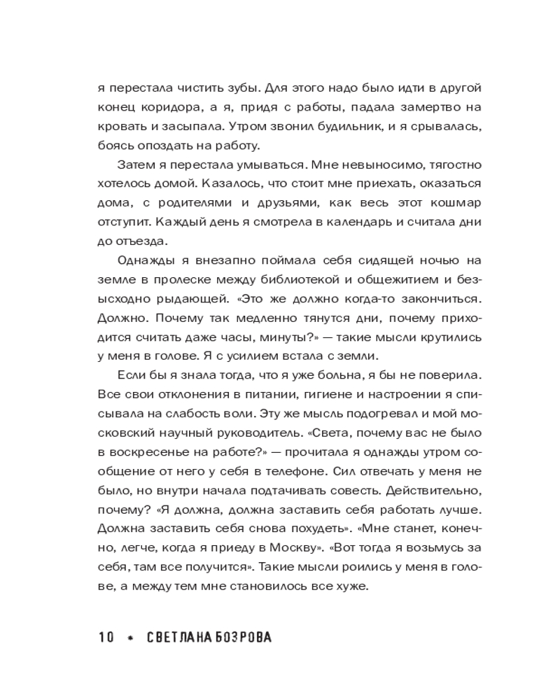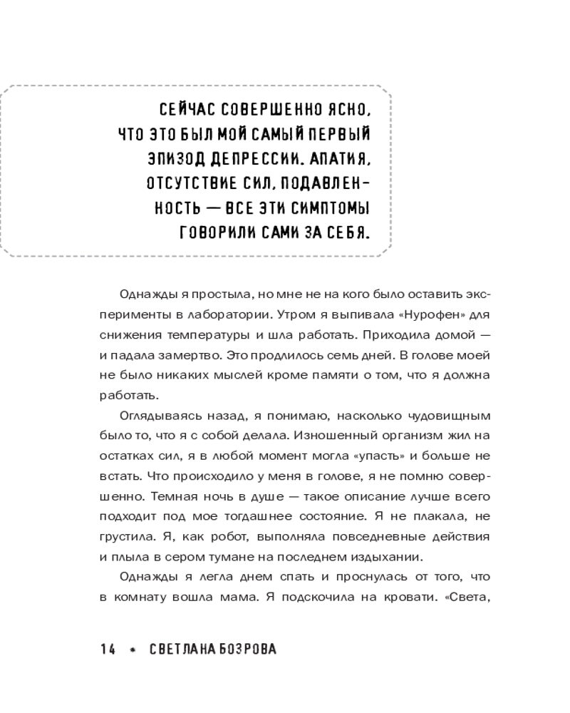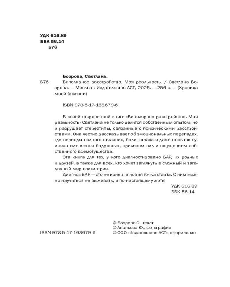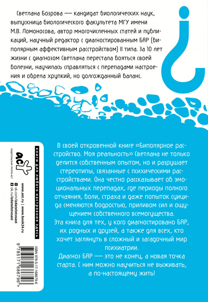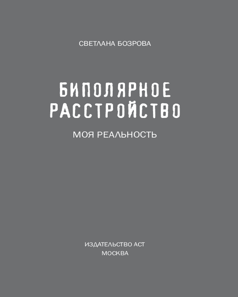 Серия: Хроника моей болезни Светлана Бозрова — кандидат биологических наук, выпускница биологического факультета МГУ имени М.В. Ломоносова, автор многочисленных статей и публикаций, научный редактор с диагностированным БАР (биполярным аффективным расстройством) II типа. За 10 лет жизни с диагнозом Светлана перестала бояться своей болезни, научилась справляться с перепадами настроения и обрела хрупкий, но долгожданный баланс.