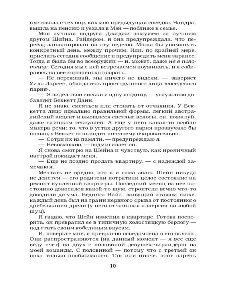 💳 Оплатить за товар можно при получении 🇰🇿 Есть бесплатная доставка по Казахстану от 1 дня 🎁 Копите бонусы с каждой покупки Серия: Хиты Эль Кеннеди У Дианы Диксон этим летом много дел. Она готовится к соревнованиям по бальным танцам, совмещает две работы и все еще возится с бывшим парнем, который никак не может понять, что между ними все кончено. И все же, несмотря на все это, у нее хватает сил послать Шейна Линдли к черту. Шейн только что переехал в дом Дианы и, похоже, намерен переспать со всей ее командой поддержки. Конечно, он высокий, великолепный хоккеист, но он вторгается на ее территорию. Здесь действуют свои правила: никаких вечеринок в квартире, никаких отношений с чирлидершами и, самое главное, не приставать к Диане. |