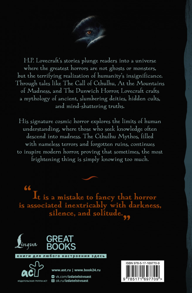 💳 Оплатить за товар можно при получении 🇰🇿 Есть бесплатная доставка по Казахстану от 1 дня 🎁 Копите бонусы с каждой покупки Серия: Great Books Произведения Г.Ф. Лавкрафта погружают читателей во вселенную, где главный ужас — не призраки или чудовища, а пугающее осознание ничтожности человечества. В таких рассказах, как «Зов Ктулху», «Хребты Безумия» и «Ужас Данвича», Лавкрафт создаёт мифологию древних спящих богов, тайных культов и ужасающих откровений. Его фирменный стиль — космический ужас — исследует пределы человеческого разума, где те, кто жаждет знаний, неизбежно обречены на безумие. Мифы Ктулху, наполненные безымянными ужасами и забытыми руинами, продолжают вдохновлять современных авторов, доказывая, что иногда самое страшное — это просто знать слишком много. |