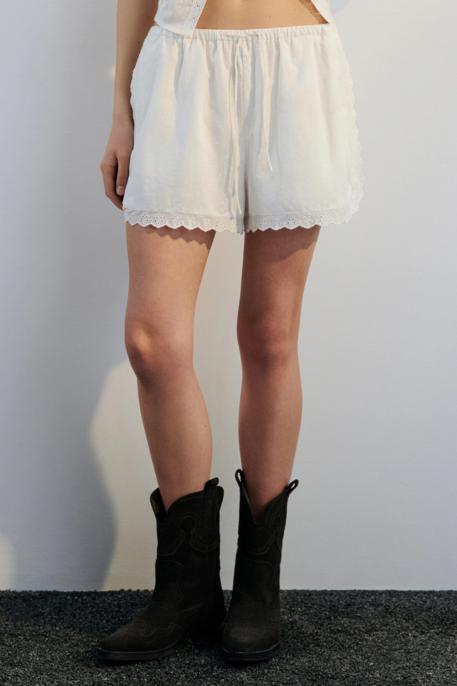 Короткие женские шорты прямого кроя выполнены из лёгкой и дышащей 100% хлопковой ткани с мягкой вискозной подкладкой. Модель с классической средней посадкой подчёркивает талию и дополнена эластичным поясом без завязок. Шорты оснащены двумя боковыми карманами в шве, а короткие штанины выше колена украшены небольшими разрезами по бокам и кружевной отделкой. Эти летние шорты подойдут для повседневных, уличных и пляжных образов в жаркую погоду, обеспечивая комфорт в течение всего дня. Сочетай их с воздушными топами из новой коллекции Befree или с любимыми вещами из гардероба. Ажурные хлопковые шорты легко впишутся в кэжуал-луки и помогут создать модный пижамный аутфит в стиле Pinterest.