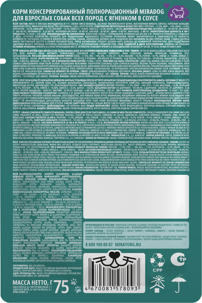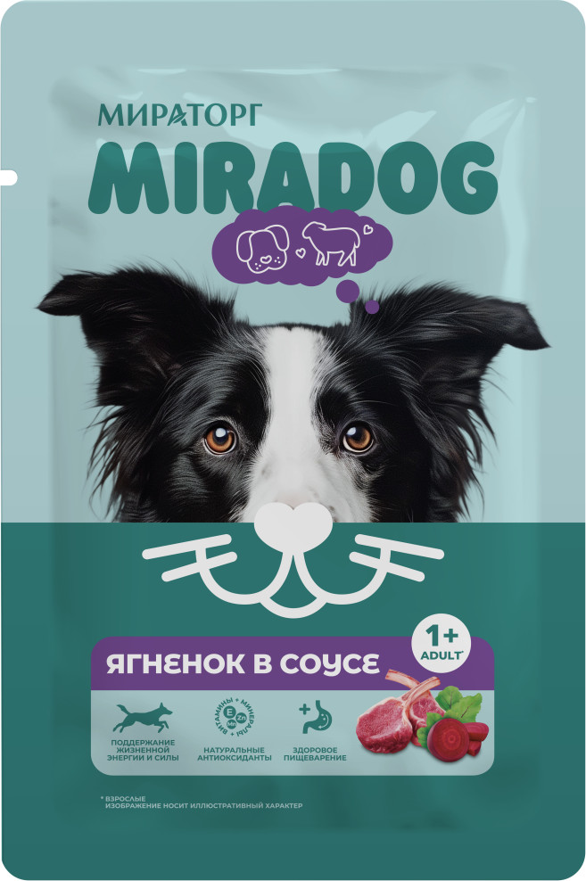 Miradog Корм консервированный полнорационный для взрослых собак всех пород с ягненком в соусе