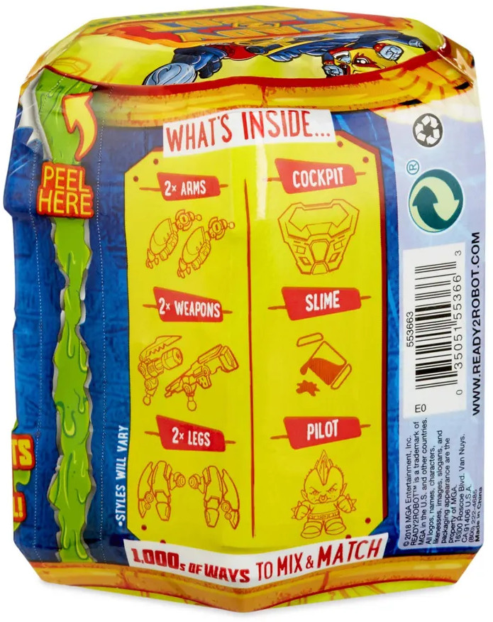 Представляем вашему вниманию новую игрушку трансформер для мальчиков Реди ту Робот от компании MGA – создателей знаменитого шара LOL! Теперь и мальчики могут наслаждаться игрушкой-сюрпризом, распаковывать слой за слоем и собирать коллекцию. Упаковка игрушки представляет собой капсулу, состоящую из 4 отсеков и упакованную в многослойную обёртку: за 1-ым слоем прячется инструкция по эксплуатации; за 2-ым – памятка коллекционера, в которой обозначены все роботы и все пилоты, которых вы можете найти в наборе, и сама капсула. Отсеки капсулы пронумерованы, и, согласно нумерации, их нужно открывать от нижнего к верхнему: в 1-ом и 2-ом отсеке находятся непрозрачные пакетики деталями для сборки робота; 3-й отсек пустой; в 4-ом отсеке находятся непрозрачные пакетики с деталями, а также баночка со слаймом, прикрепленная внутри к верхней части капсулы. Чтобы достать баночку, необходимо надавить на неё, и она вылетит со свистом. Внутри вы найдете слайм и пилота. Распаковав все составляющие набора, вы можете собрать робота и установить в его кабину пилота. Детали универсальны, а это значит, что вы можете сочетать разные из разных наборов – всего более 1000 комбинаций роботов! С такими фигурками будет весело играть, придумывать различные истории, коллекционировать, обмениваться ими с друзьями. Коллекционирование развивает терпение и усидчивость, а игра с небольшими фигурками - воображение и мелкую моторику.