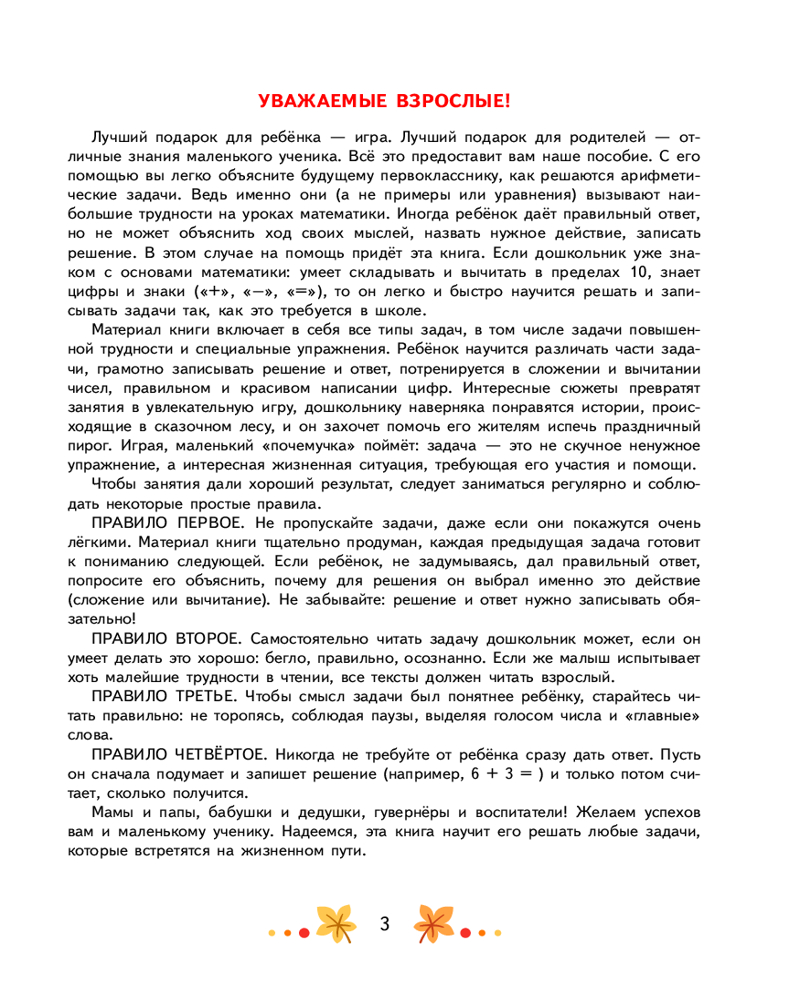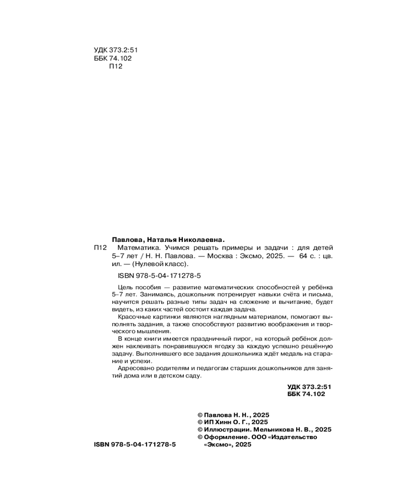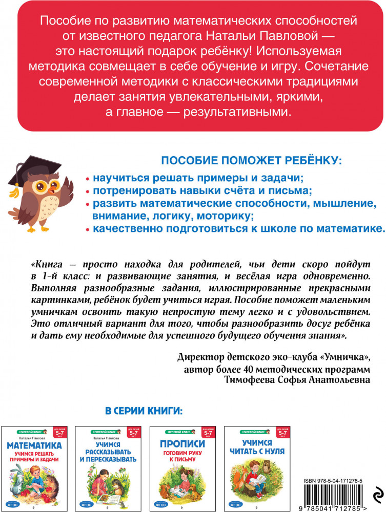 💳 Оплатить за товар можно при получении 🇰🇿 Есть бесплатная доставка по Казахстану от 1 дня 🎁 Копите бонусы с каждой покупки Серия: Нулевой класс Книга по развитию математических способностей у старших дошкольников, соответствующая ФГОС, от известного педагога Натальи Павловой успешно сочетает в себе обучение с увлекательной игрой. Пособие поможет ребенку легко научиться решать любые задачи, а также правильно записывать решение и ответ. Он потренируется в сложении и вычитании, правильном и красивом написании чисел. Занимательные сюжеты превратят занятие в увлекательную игру: дошкольнику наверняка понравятся истории, происходящие в сказочном лесу, и он захочет получать понравившуюся ягодку за каждую решенную задачу и украсить ими праздничный пирог. |