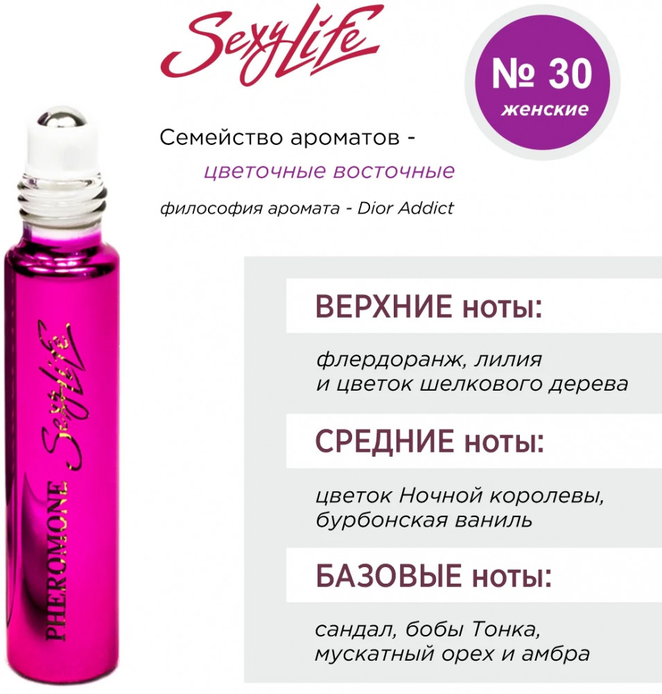 Духи масляные женские с феромонами «Sexy life» № 30 — чувственный, мягкий и женственный парфюм. Предназначен для современной женщины, целеустремленной и напористой.