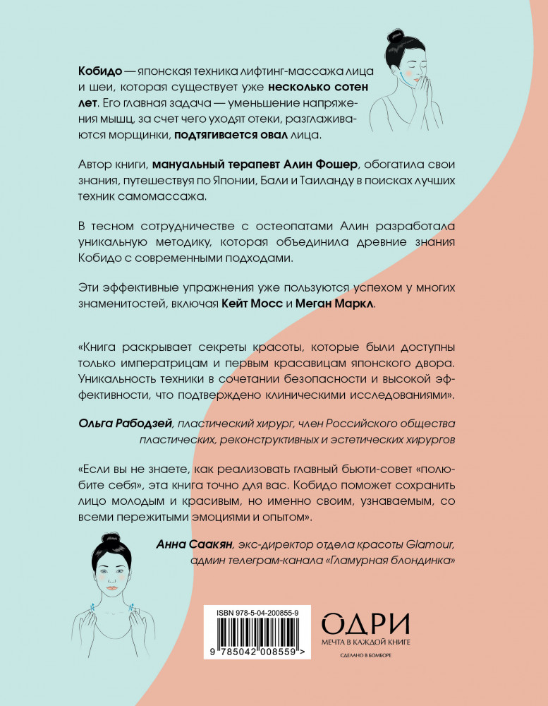 💳 Оплатить за товар можно при получении 🇰🇿 Есть бесплатная доставка по Казахстану от 1 дня 🎁 Копите бонусы с каждой покупки Серия: Аэробика для лица Кобидо, что в переводе означает «древний путь красоты», — японская техника массажа лица и шеи, которая существует уже несколько сотен лет. Его главная задача — уменьшение напряжения мышц, за счет чего улучшается лимфодренаж, уходят отеки, подтягивается овал лица и разглаживаются морщинки. Автор книги, француженка Алин Фошер, является дипломированным мануальным терапевтом. Она обогатила свои знания, путешествуя по Японии, Бали и Таиланду в поисках лучших техник самомассажа. В тесном сотрудничестве с остеопатами и психотерапевтами Алин разработала уникальную методику лифтинг-массажа, которая объединила древние знания Кобидо с современными подходами. Эти эффективные упражнения уже пользуются успехом у многих знаменитостей, включая Кейт Мосс и Меган Маркл. |